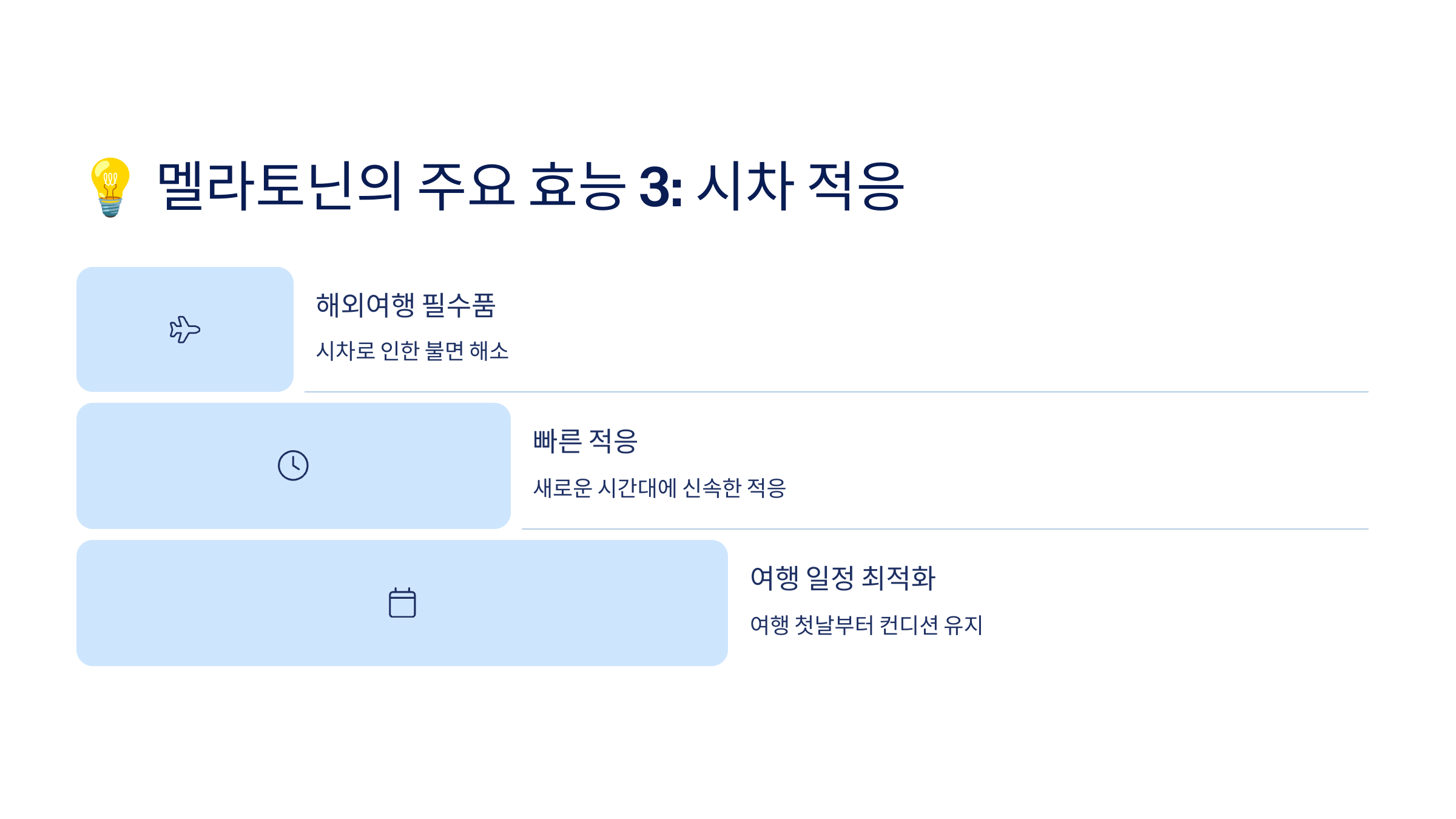 👉 시차 적응용으로 매우 유용해요! 목적지 시간에 맞춰 섭취하면 효과적이에요.