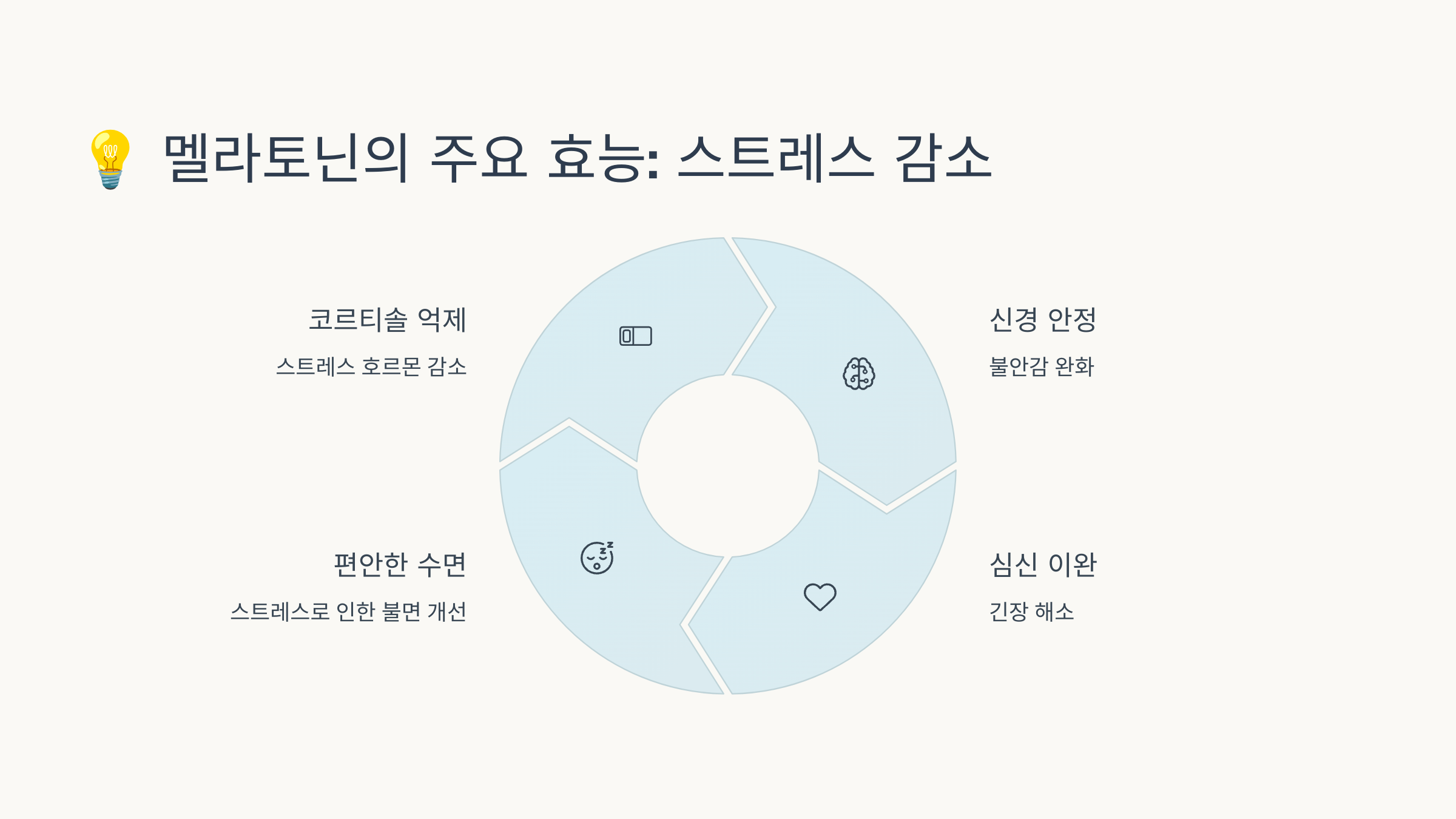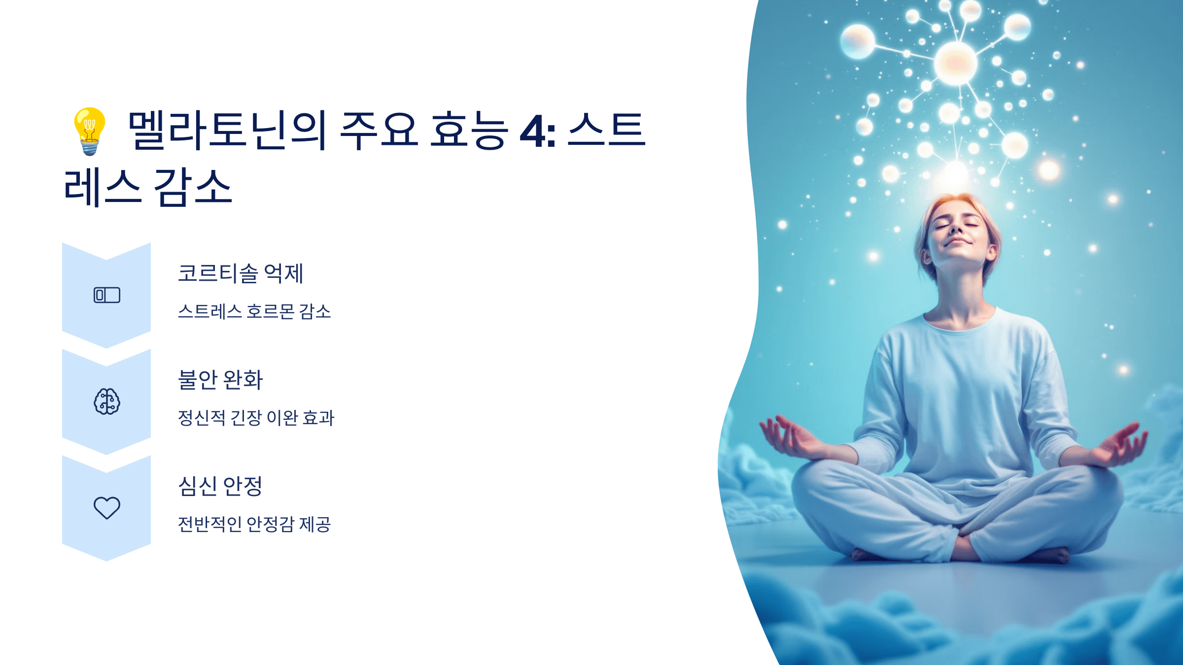 멜라토닌은 코르티솔(스트레스 호르몬)을 억제하는 데 도움을 줘요.