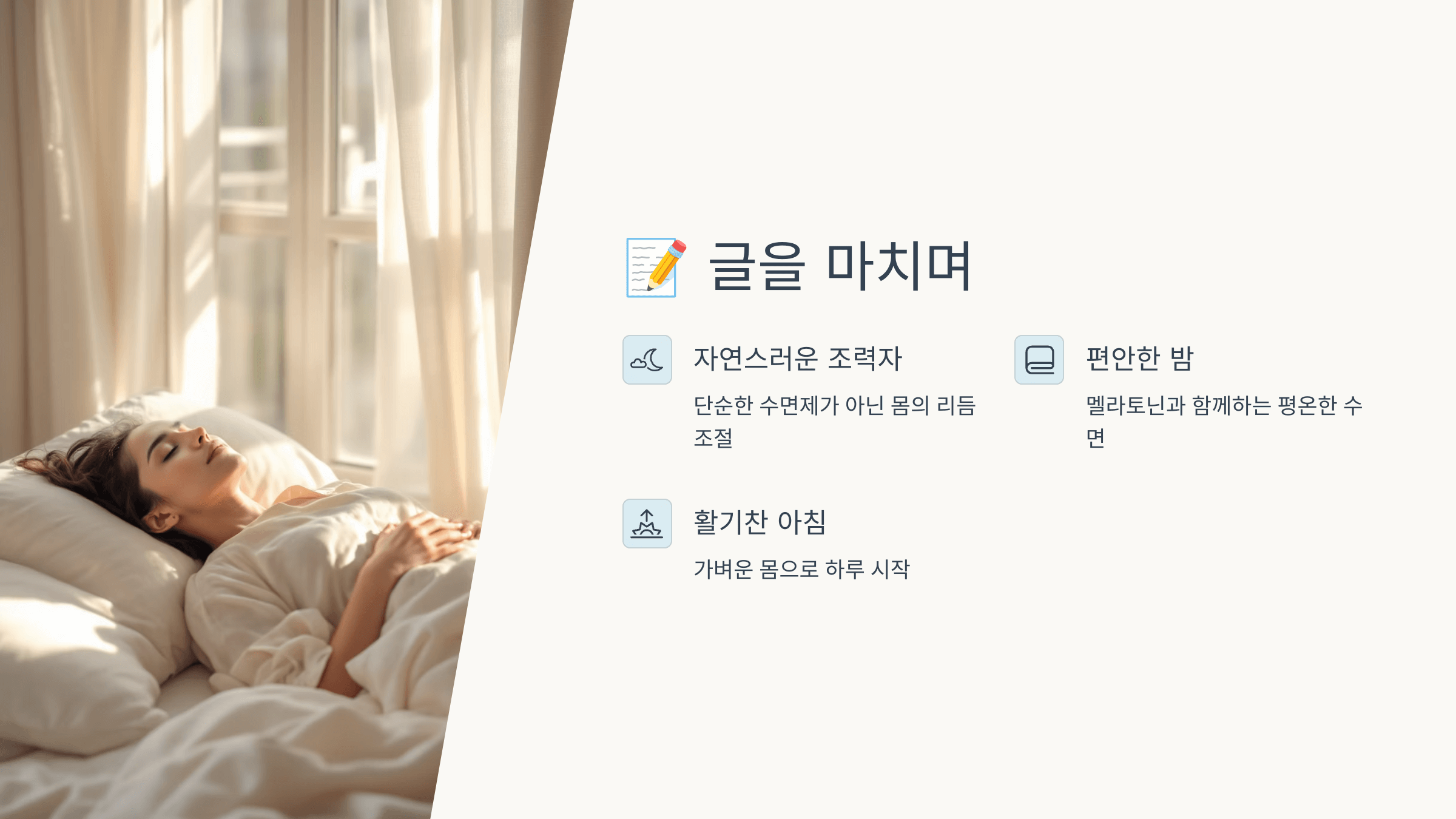 ✔️ 멜라토닌은 약이 아니라 ‘호르몬 보충제’이기 때문에 의존하지 않고 생활습관 개선과 병행하는 것이 핵심입니다!