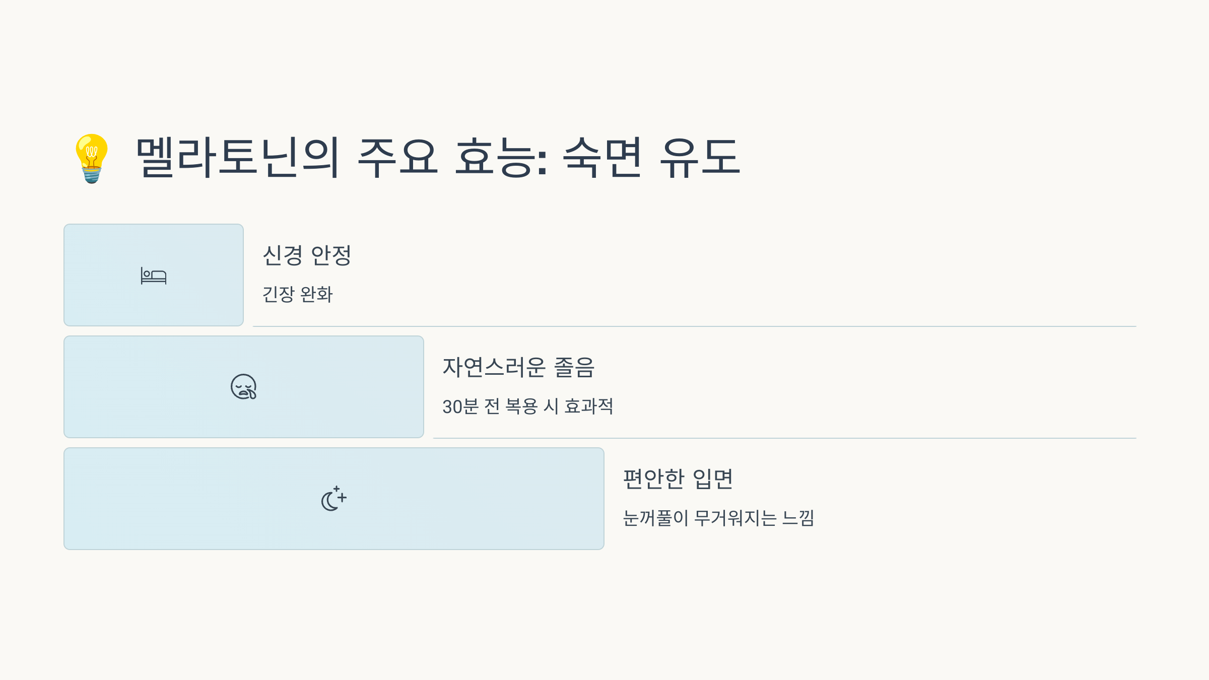 - 낮 졸림: 멜라토닌 잔여 효과로 낮에 졸릴 수 있어요. 그래서 복용 타이밍이 정말 중요해요!
