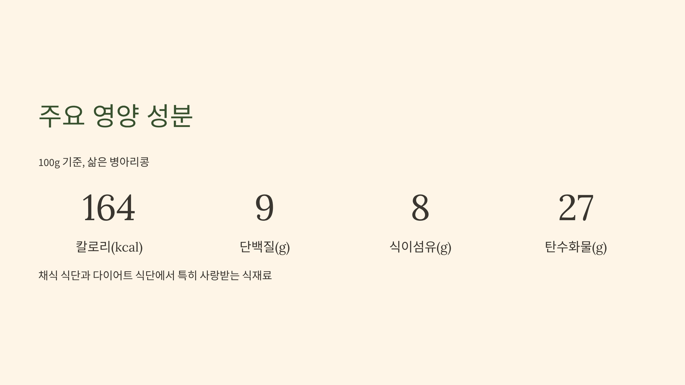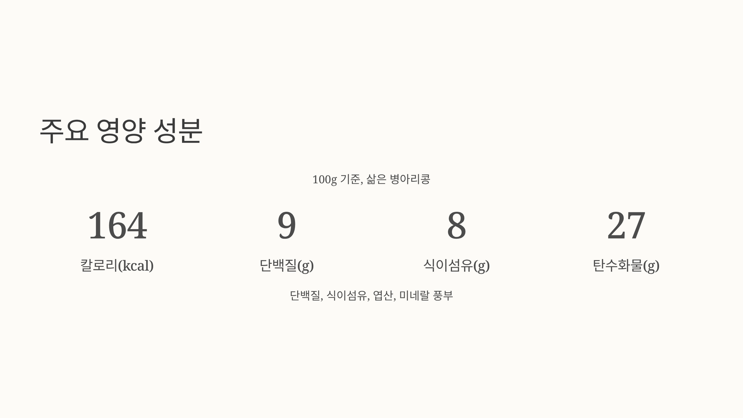 🧬 주요 영양 성분 (100g 기준, 삶은 병아리콩)