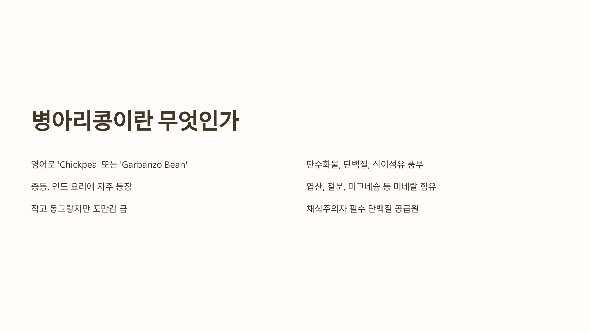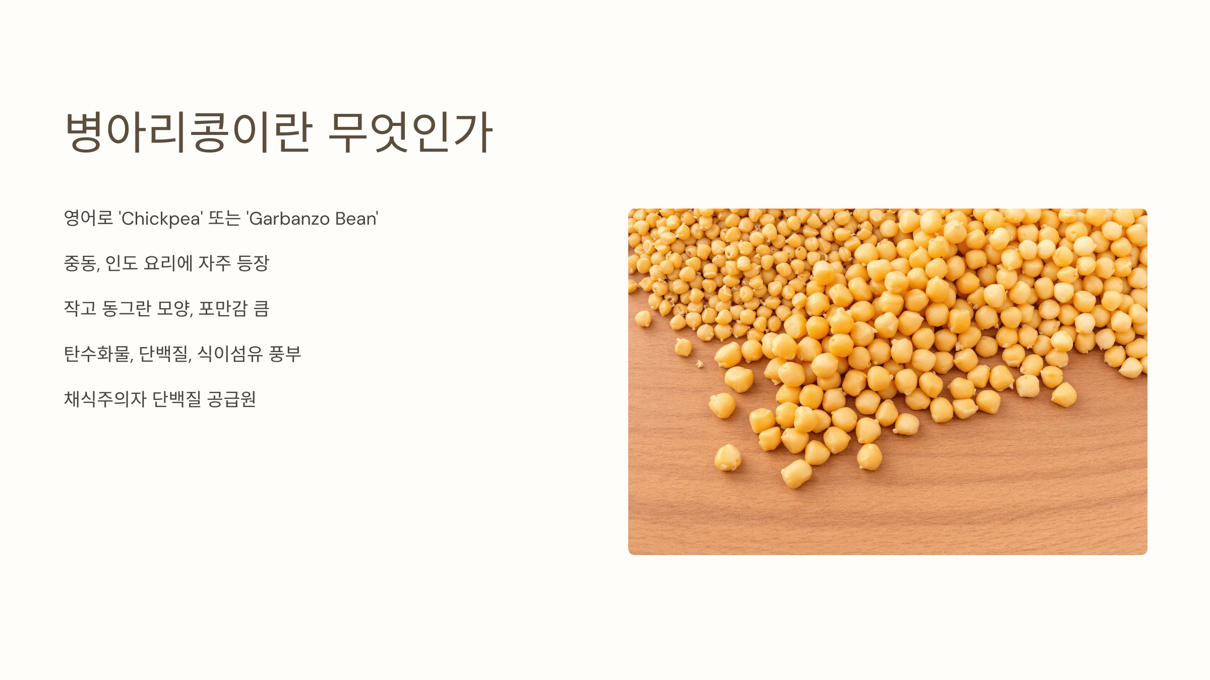 병아리콩은 영어로 ‘Chickpea’, 또는 ‘Garbanzo Bean’이라고도 불리며, 주로 중동이나 인도 요리에 자주 등장하는 식재료예요. 겉모양은 작고 동그랗지만, 먹고 나면 포만감이 크고 속도 편안하더라고요. 제가 처음 병아리콩을 접한 건 인도 커리 속에서였어요. 고소한 맛과 독특한 식감이 인상적이었고, 이후 다양하게 활용해 먹기 시작했답니다.
