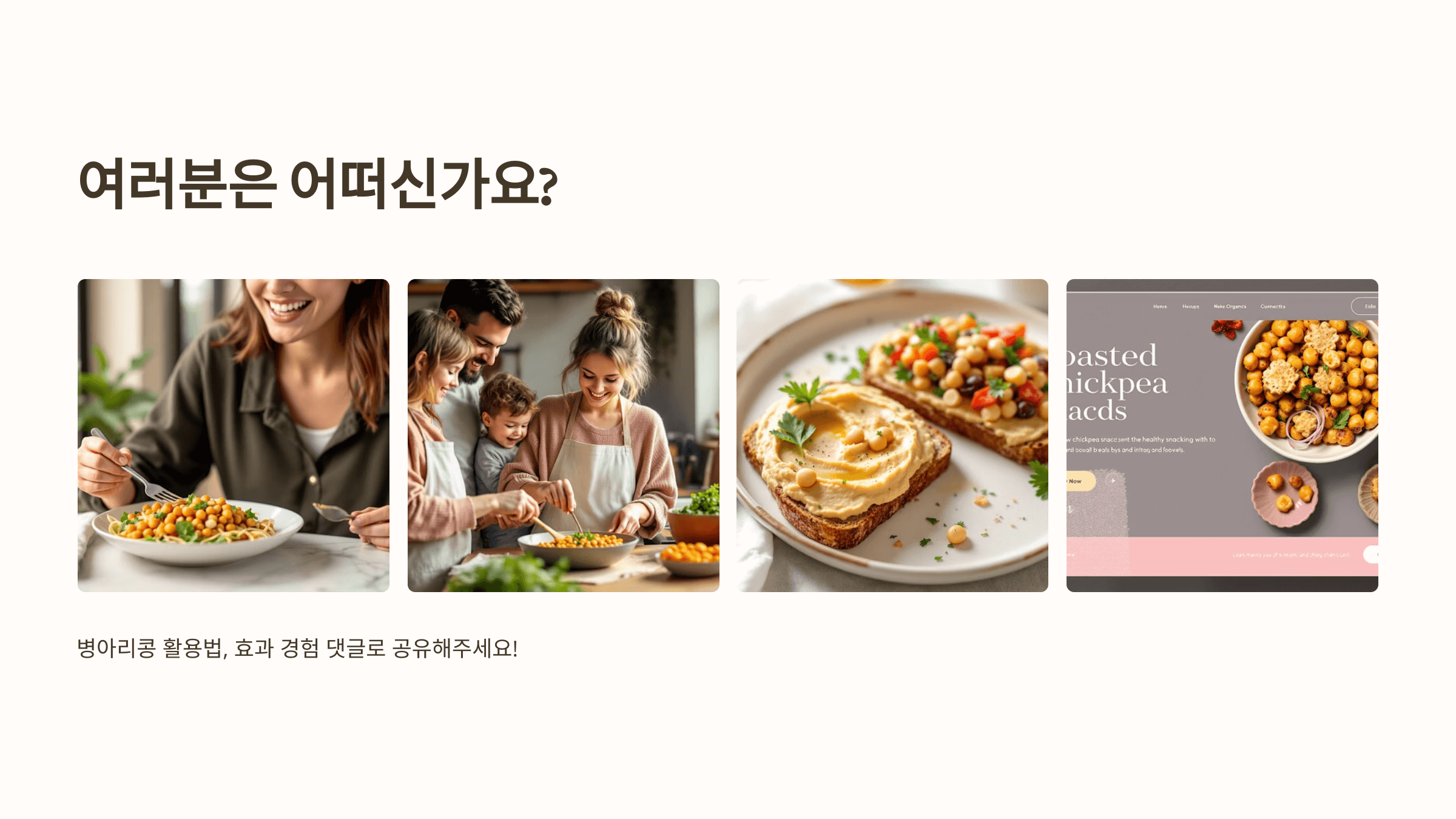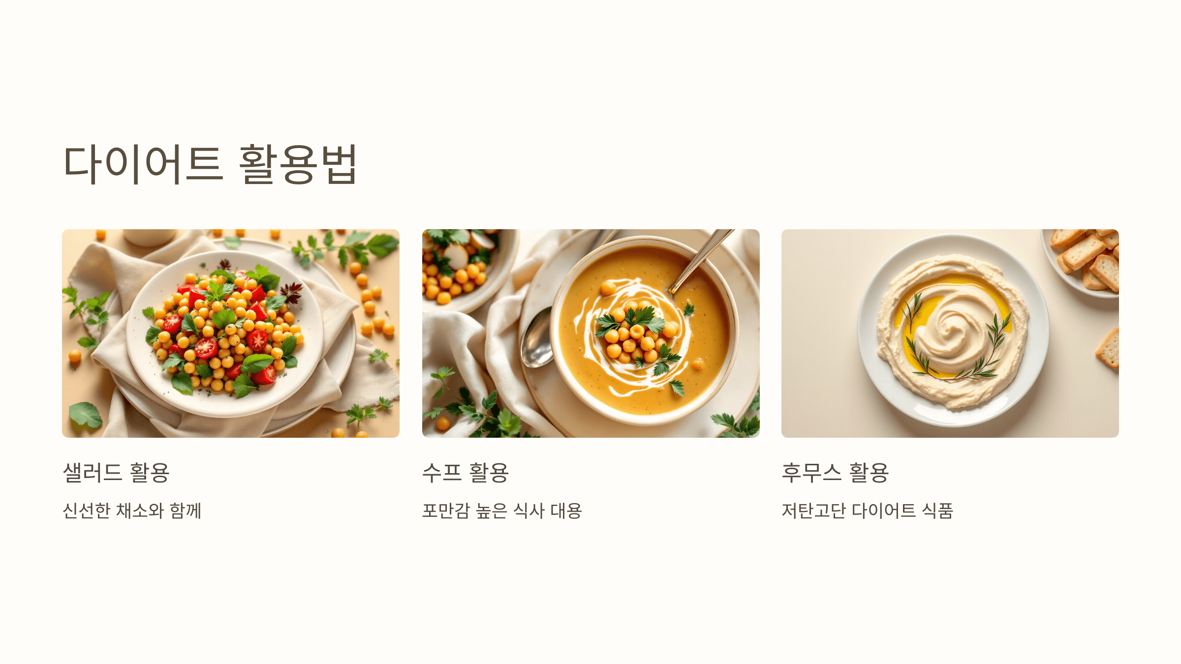 '다이어트 중에 효과 봤던 병아리콩 레시피'나 '아이와 함께 먹기 좋은 병아리콩 요리법'도 궁금하네요!