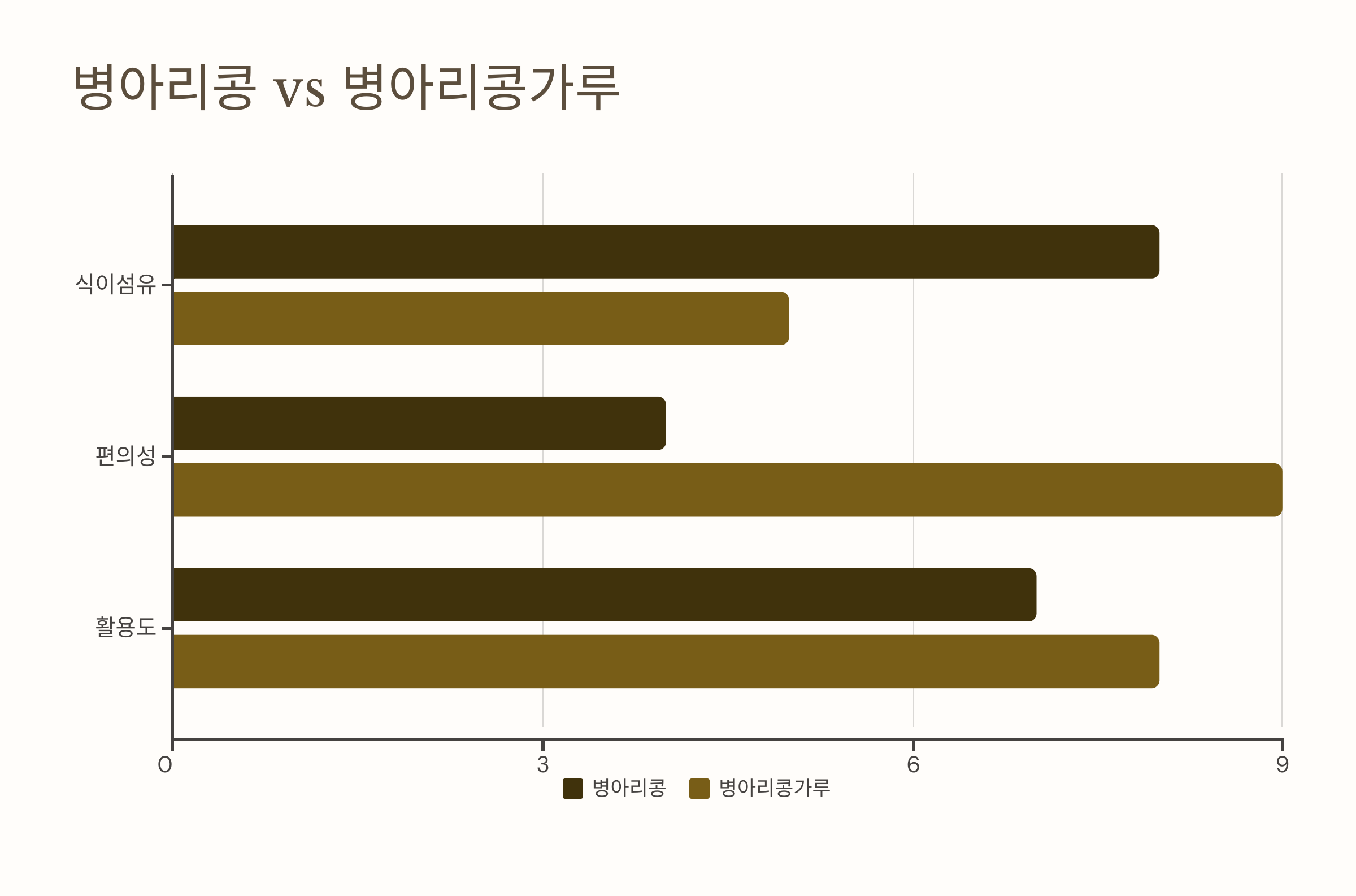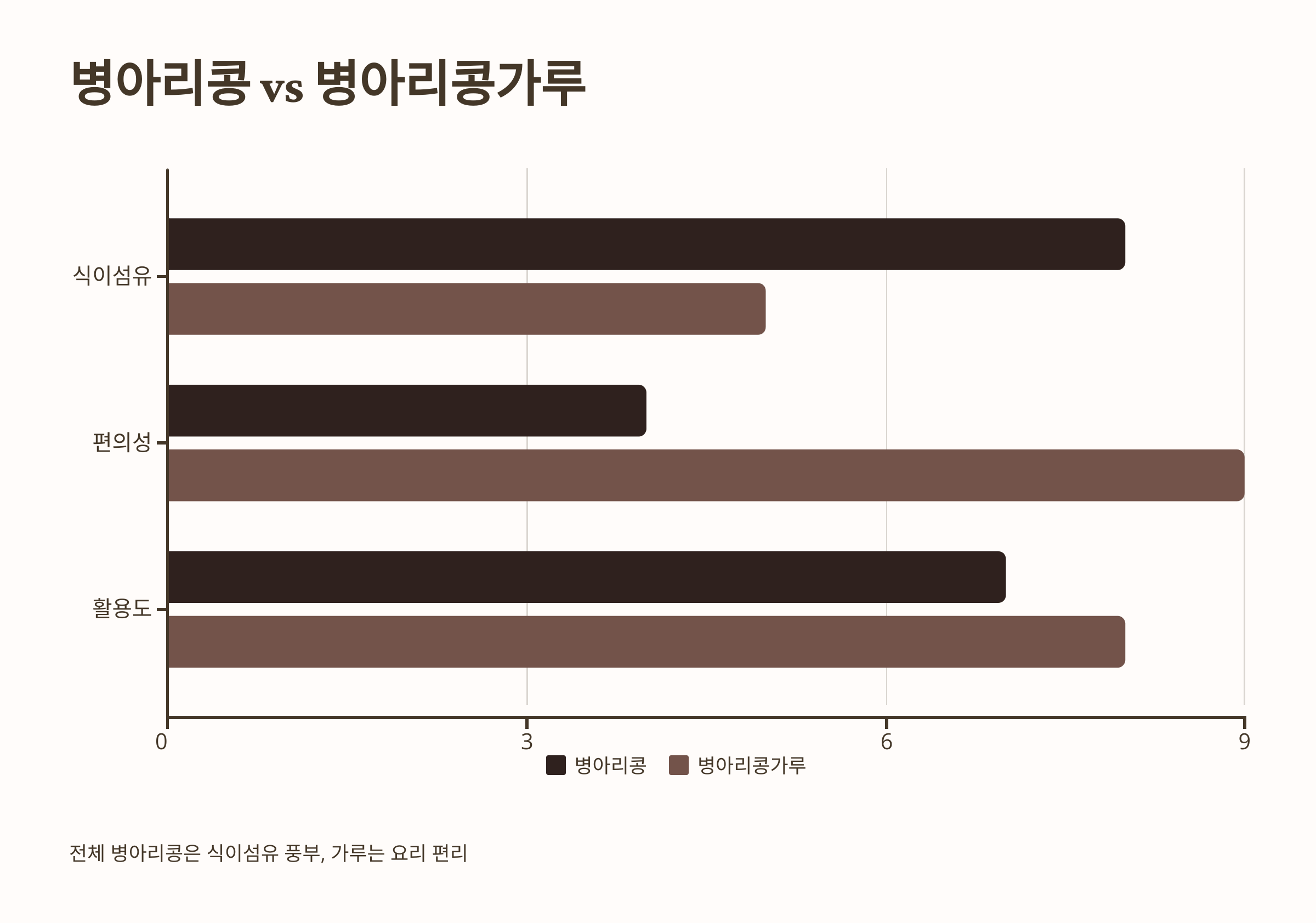 전체 병아리콩은 식이섬유가 더 많고, 가루는 요리하기 간편해요. 목적에 맞게 선택하시면 됩니다.