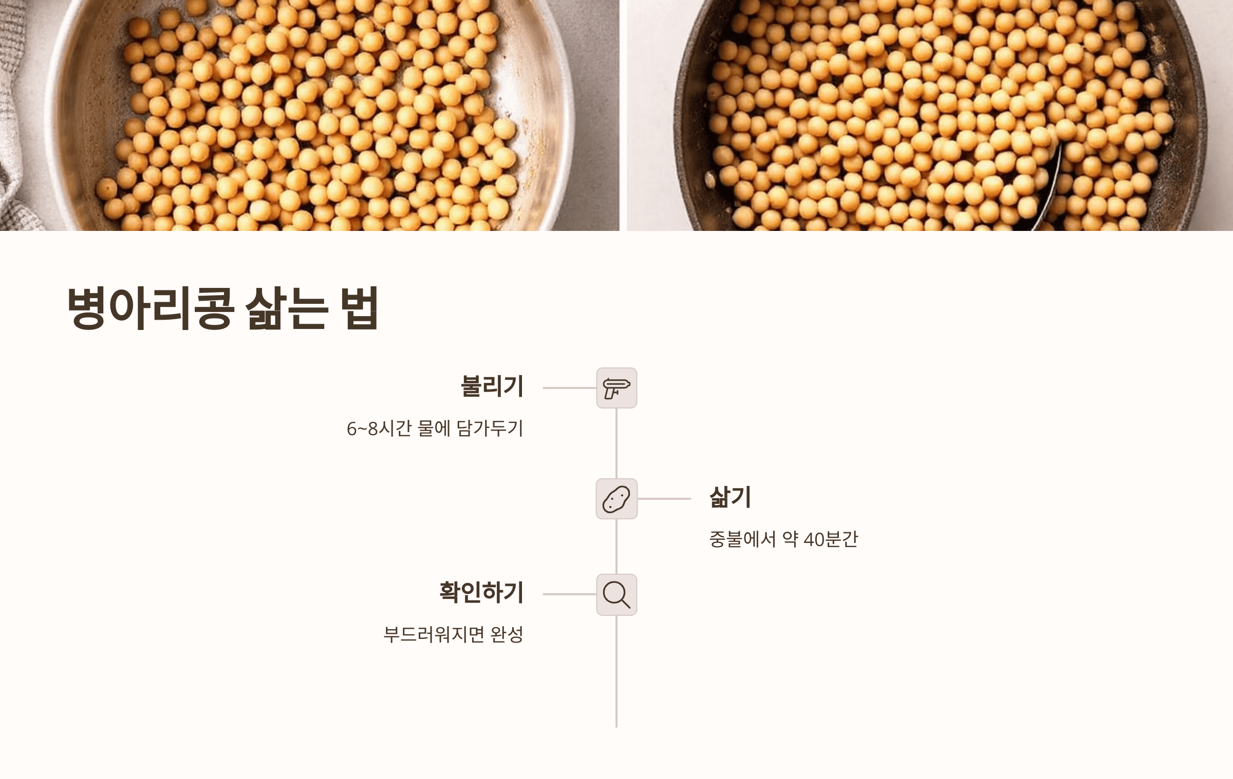 6~8시간 정도 불린 후, 약 40분간 중불에서 푹 삶아주세요. 부드러워지면 잘 익은 거예요.
