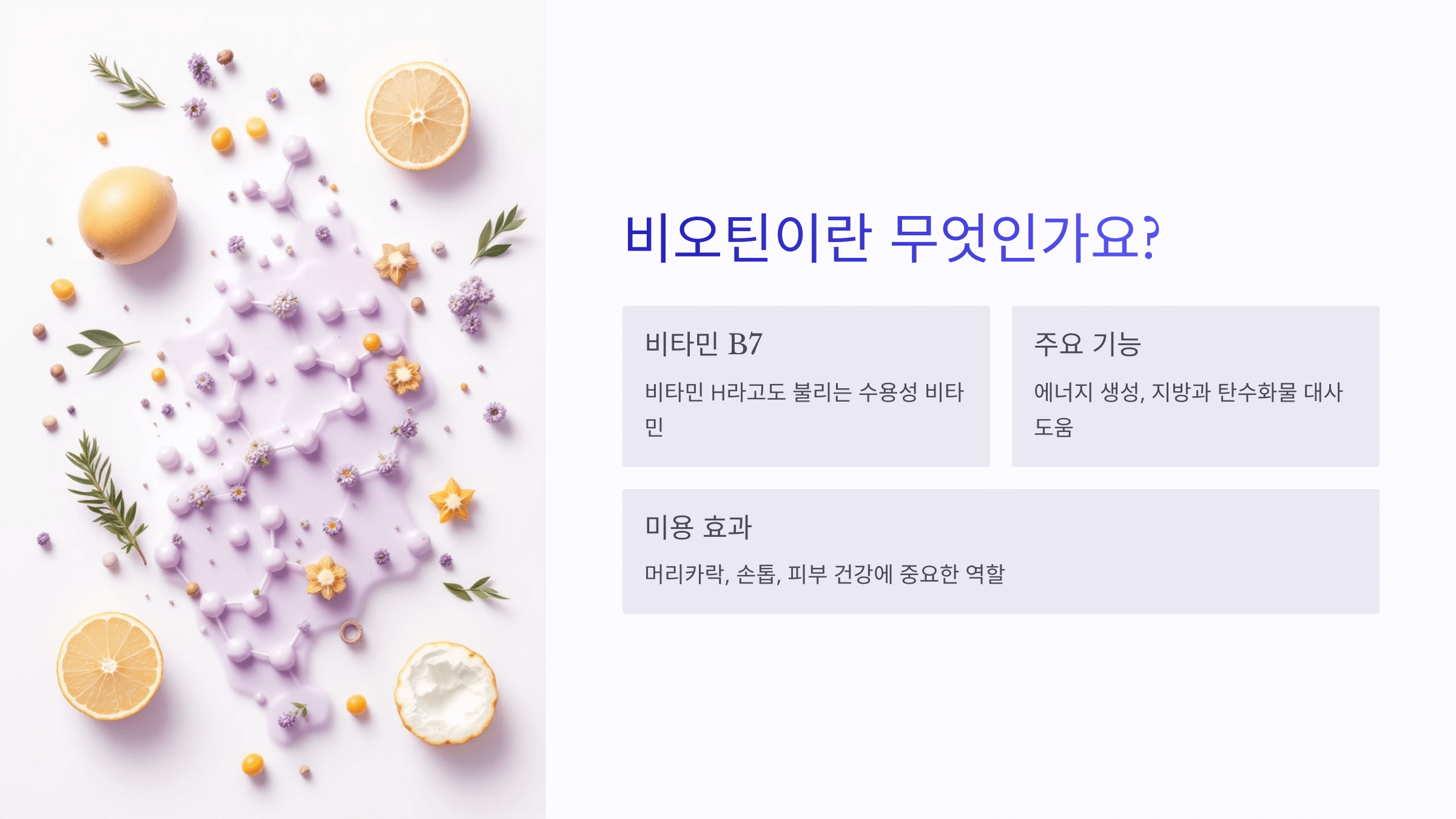 우리 몸의 에너지 생성, 지방과 탄수화물 대사, 그리고 머리카락과 손톱, 피부 건강에 중요한 역할을 하죠.