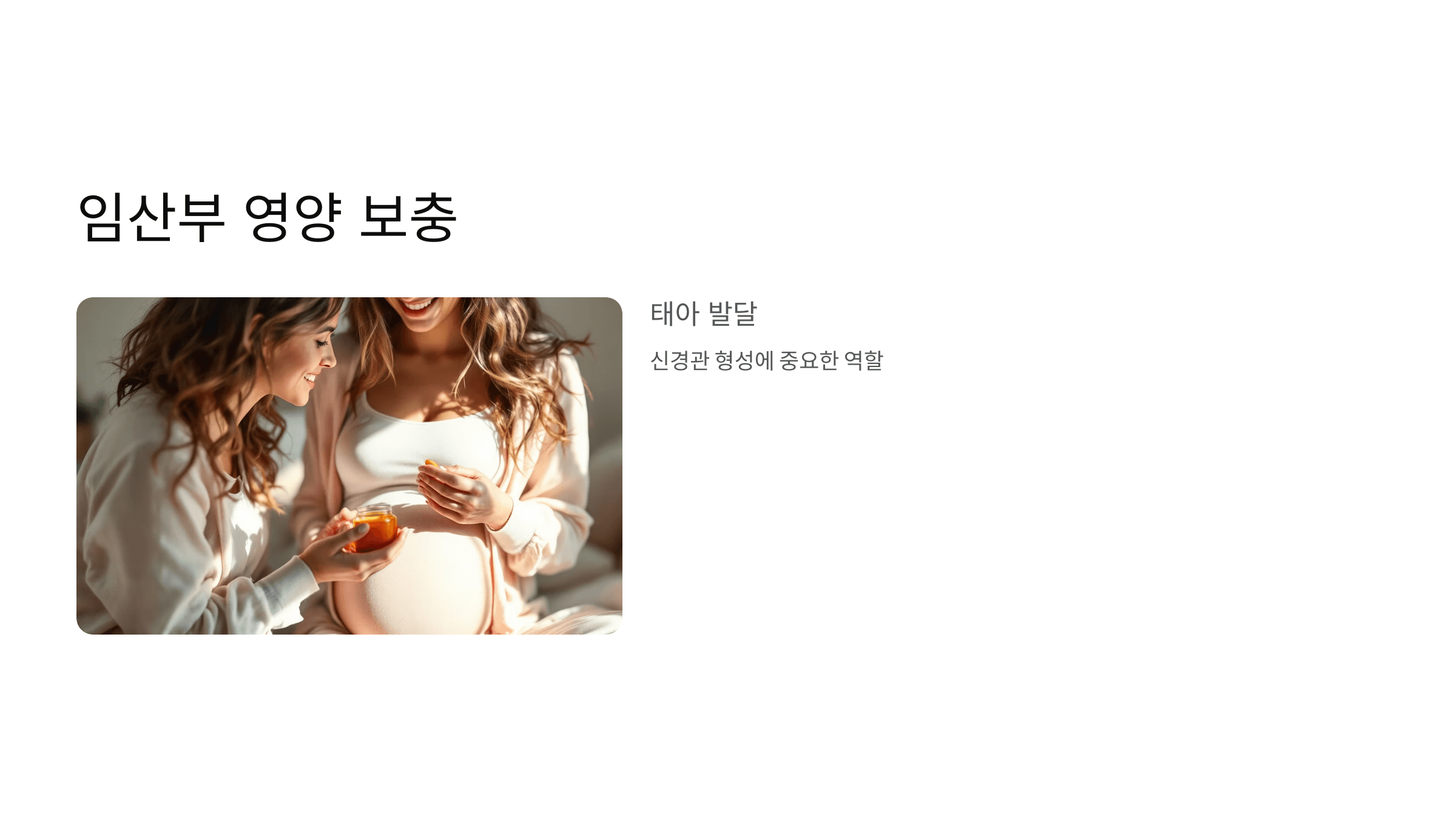 임산부에게 필요한 비타민 중 하나로, 태아의 신경 발달에도 중요한 역할을 합니다.