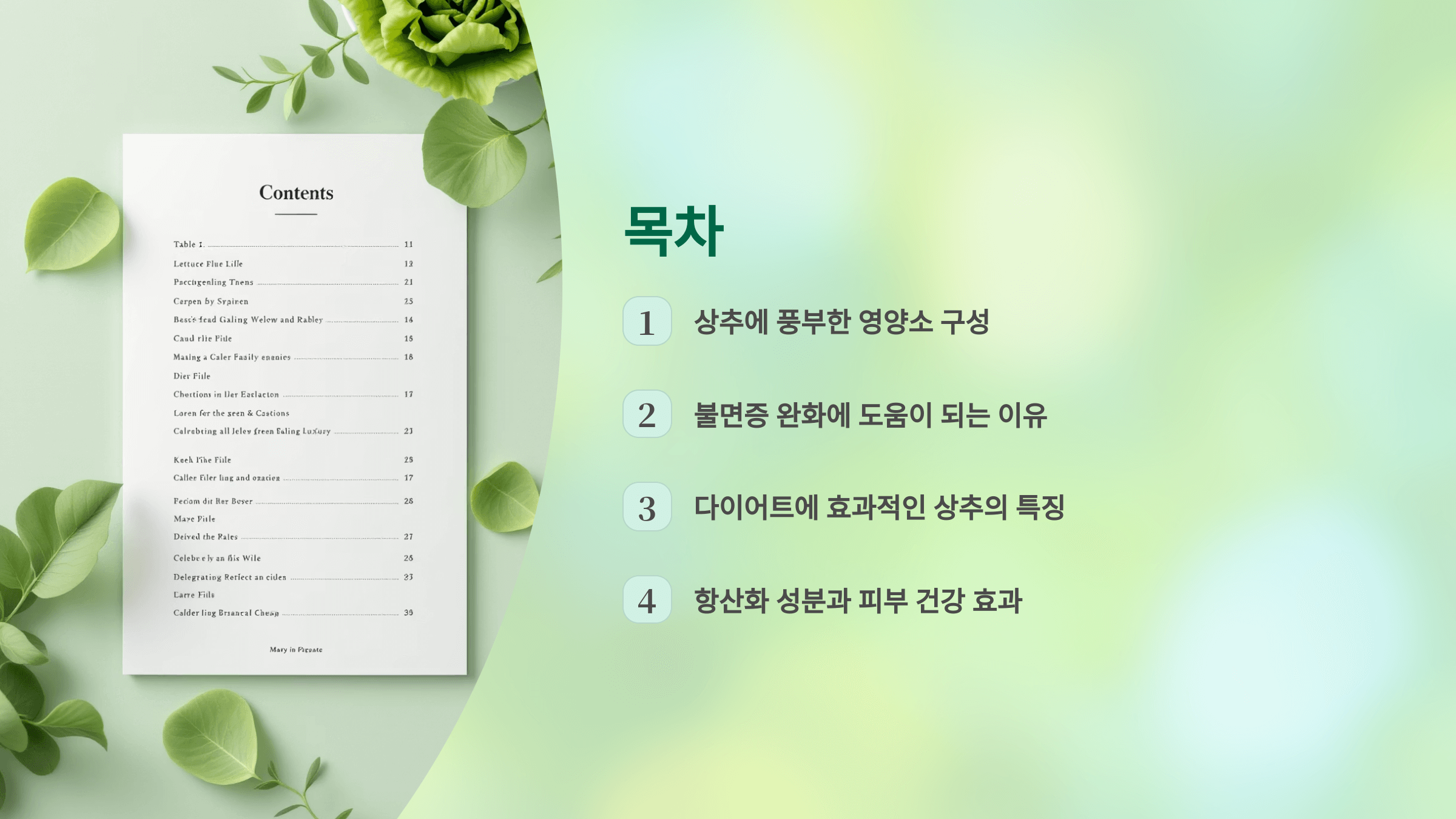상추에 함유된 락투카리움이라는 성분은 진정 효과가 있어 숙면을 돕는 데 유용합니다. 늦은 저녁엔 상추 겉절이도 추천해요.