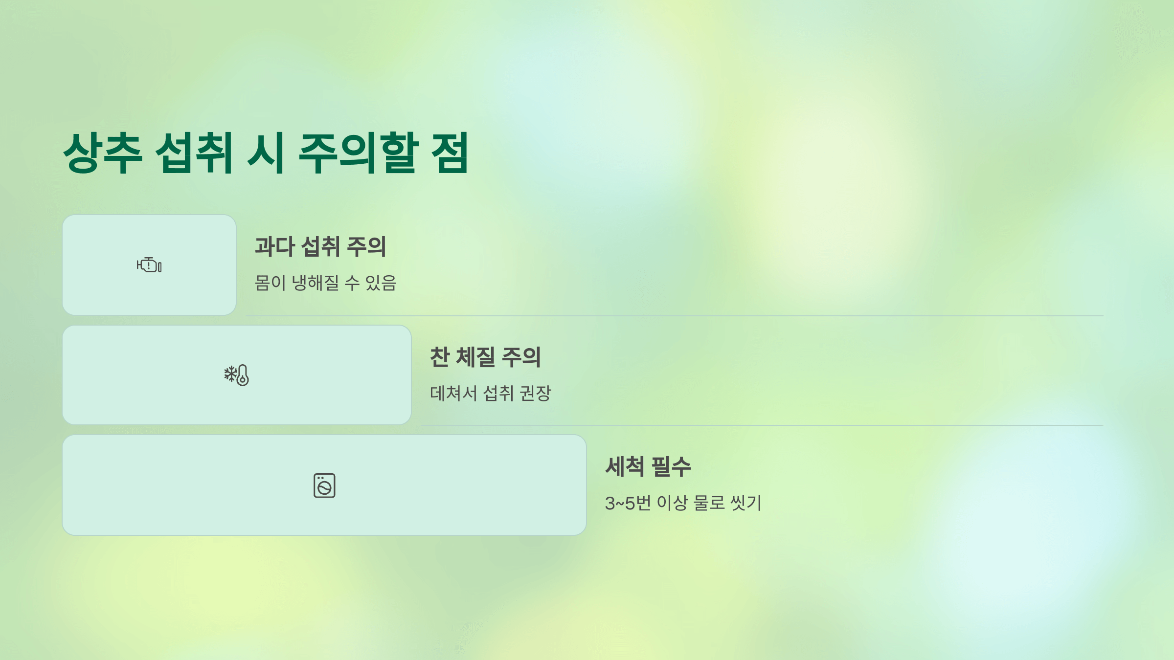 특히 몸이 찬 체질이신 분들은 생으로 너무 많이 드시기보다는 데쳐서 섭취하는 걸 추천드려요.