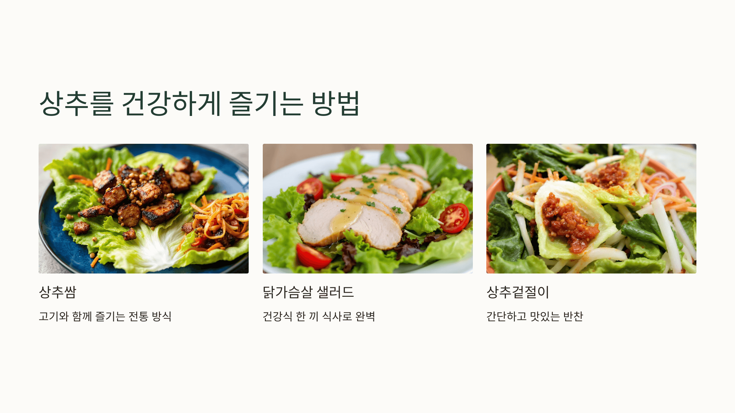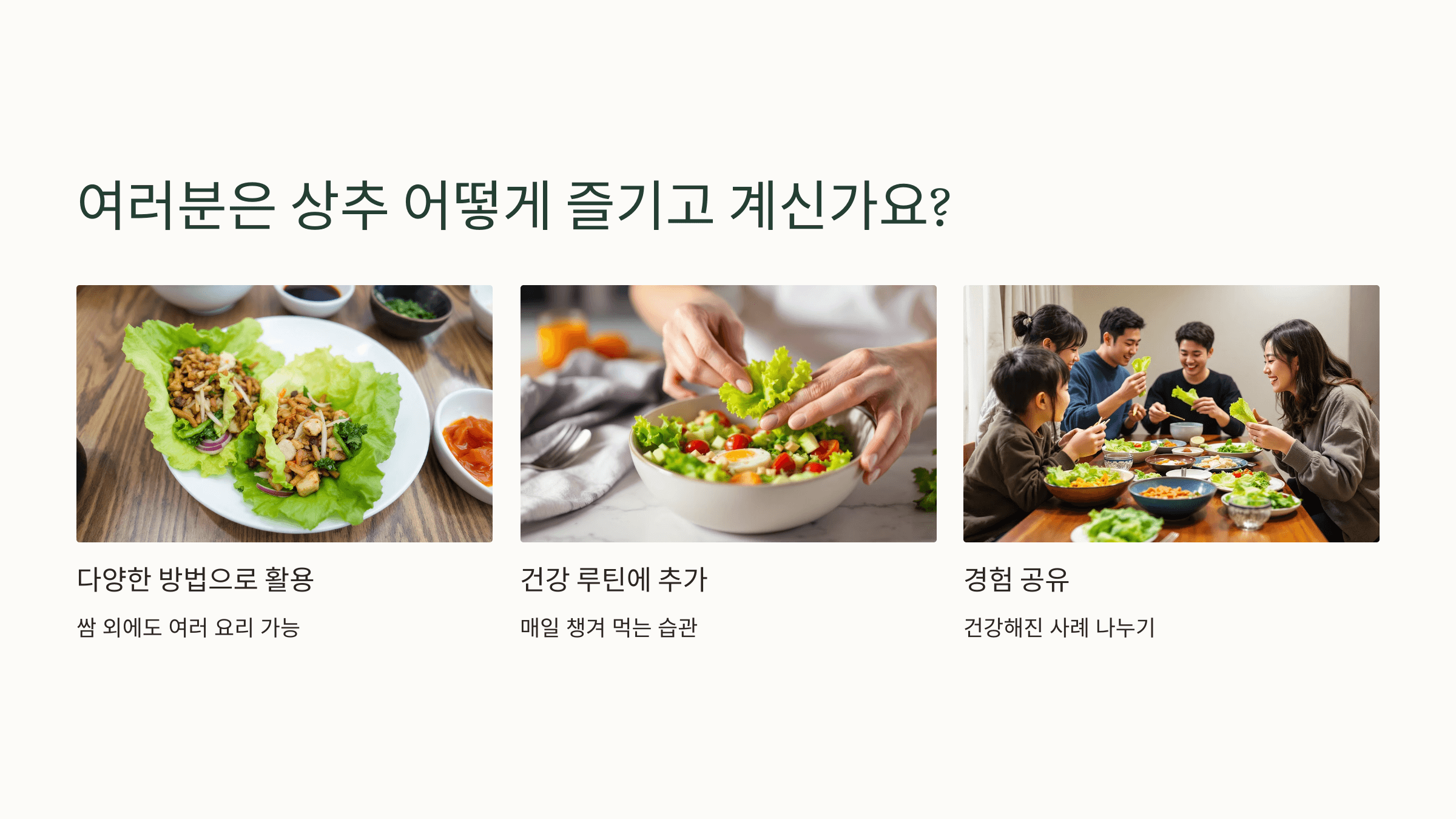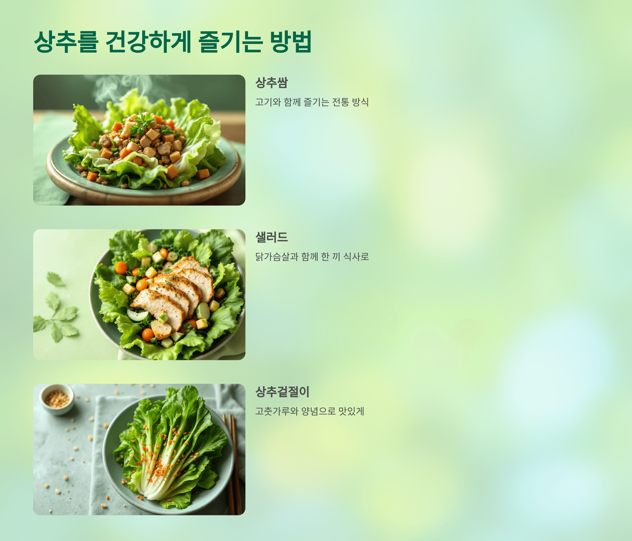 쌈 외에도 상추겉절이, 상추된장무침, 상추쌈밥, 상추샐러드 등 다양하게 응용할 수 있습니다. 조리법에 따라 맛도 달라져요!
