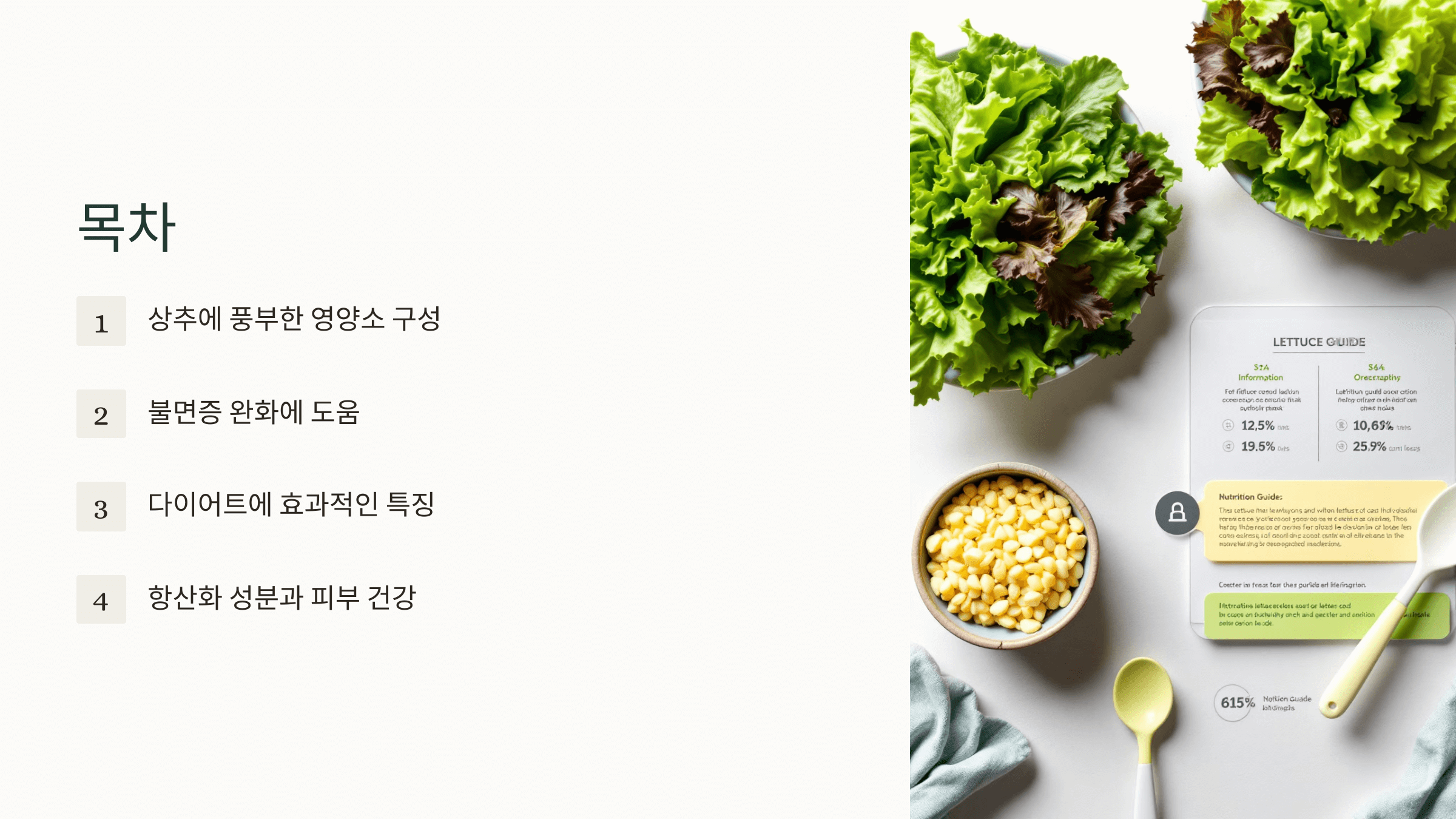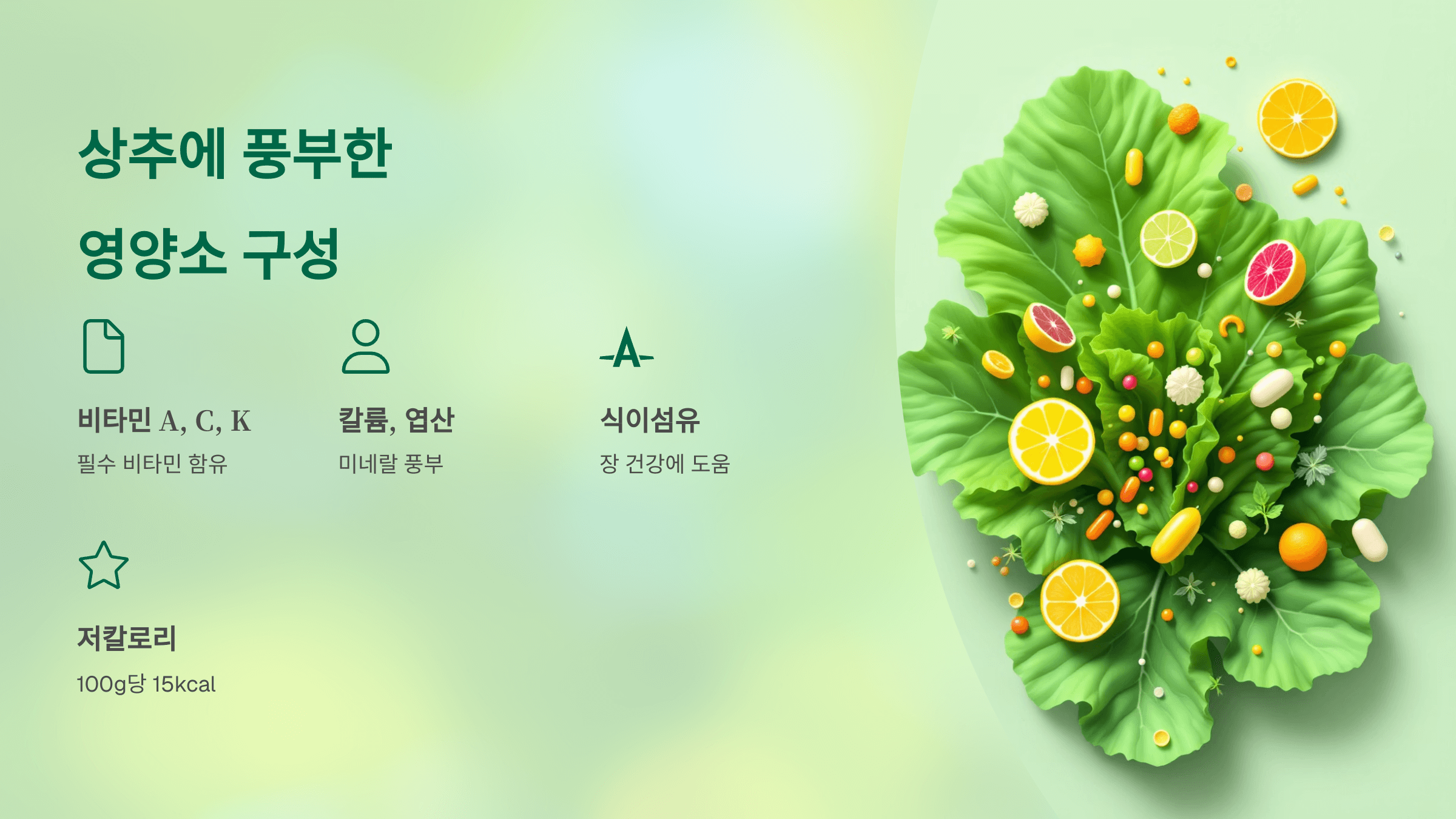 상추에는 비타민 A, C, K는 물론, 칼슘과 식이섬유가 풍부합니다. 특히 항산화 성분이 많아 피부 건강에도 좋아요!