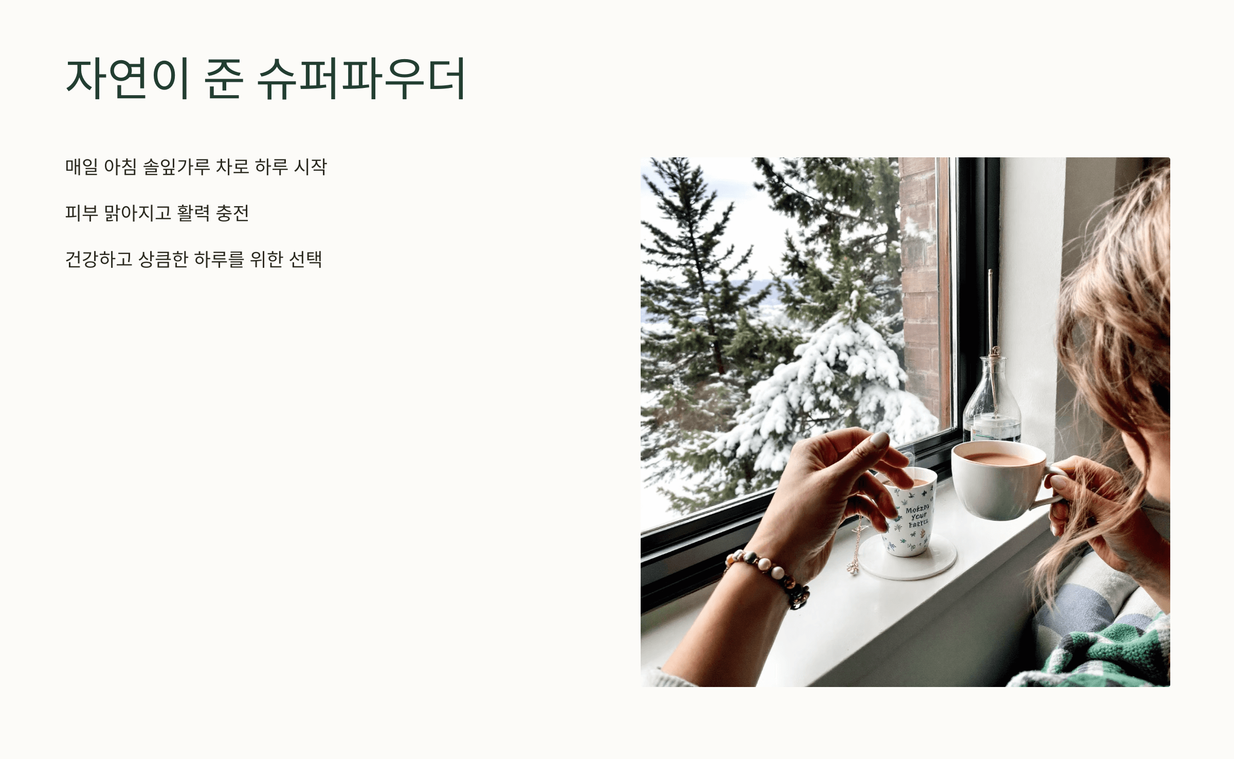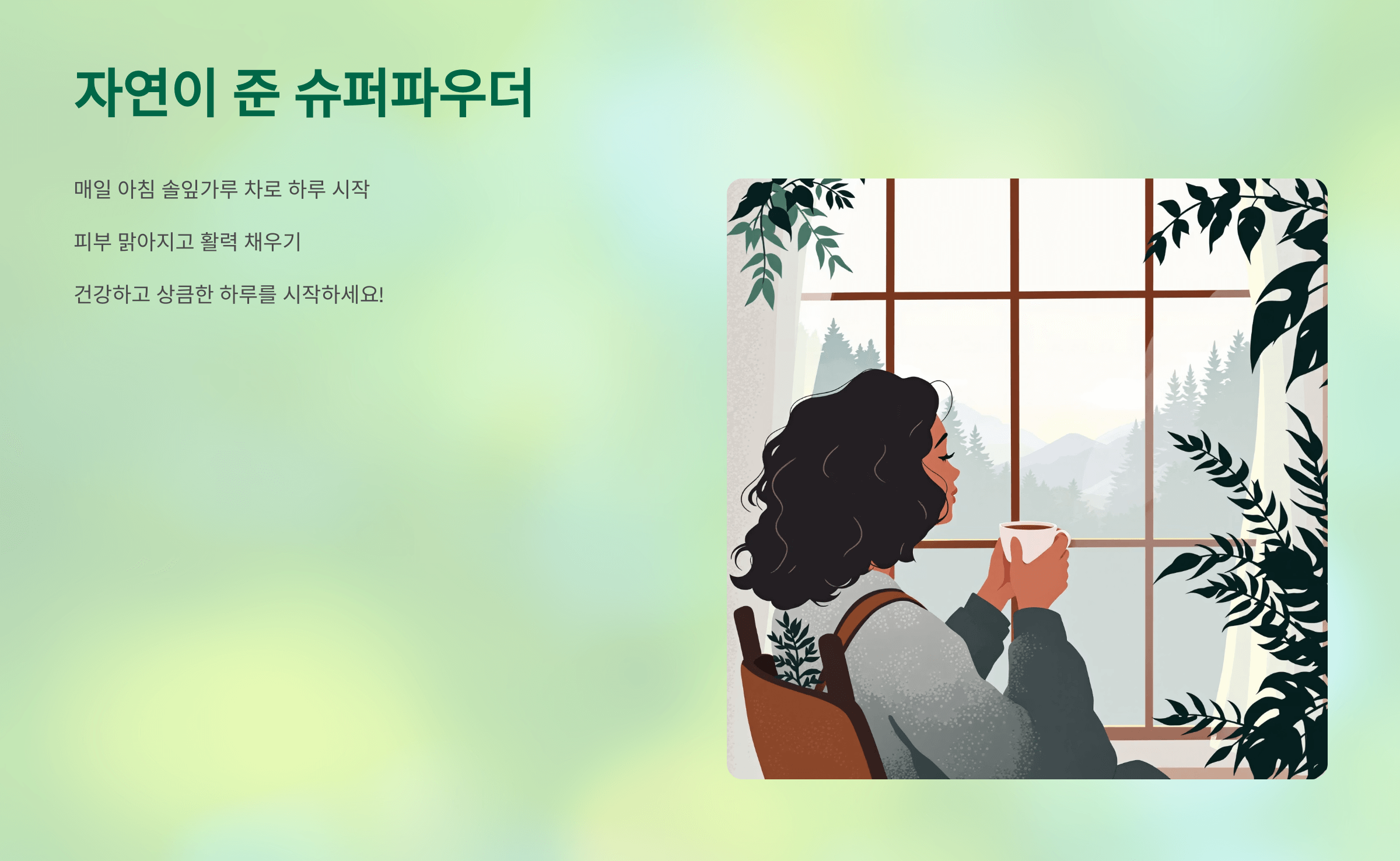 저는 매일 아침 솔잎가루 차로 하루를 시작하면서 피부도 맑아지고, 활력도 더 채워지고 있어요.