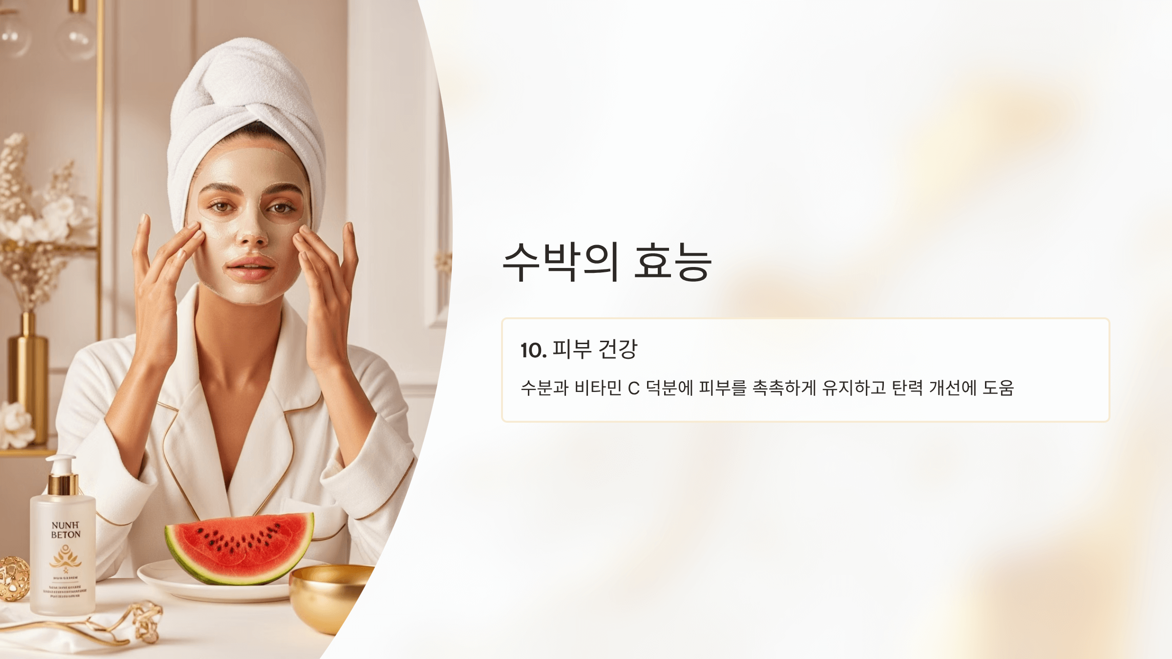 수박은 수분과 비타민이 풍부해 피부를 촉촉하게 유지시켜 줍니다.