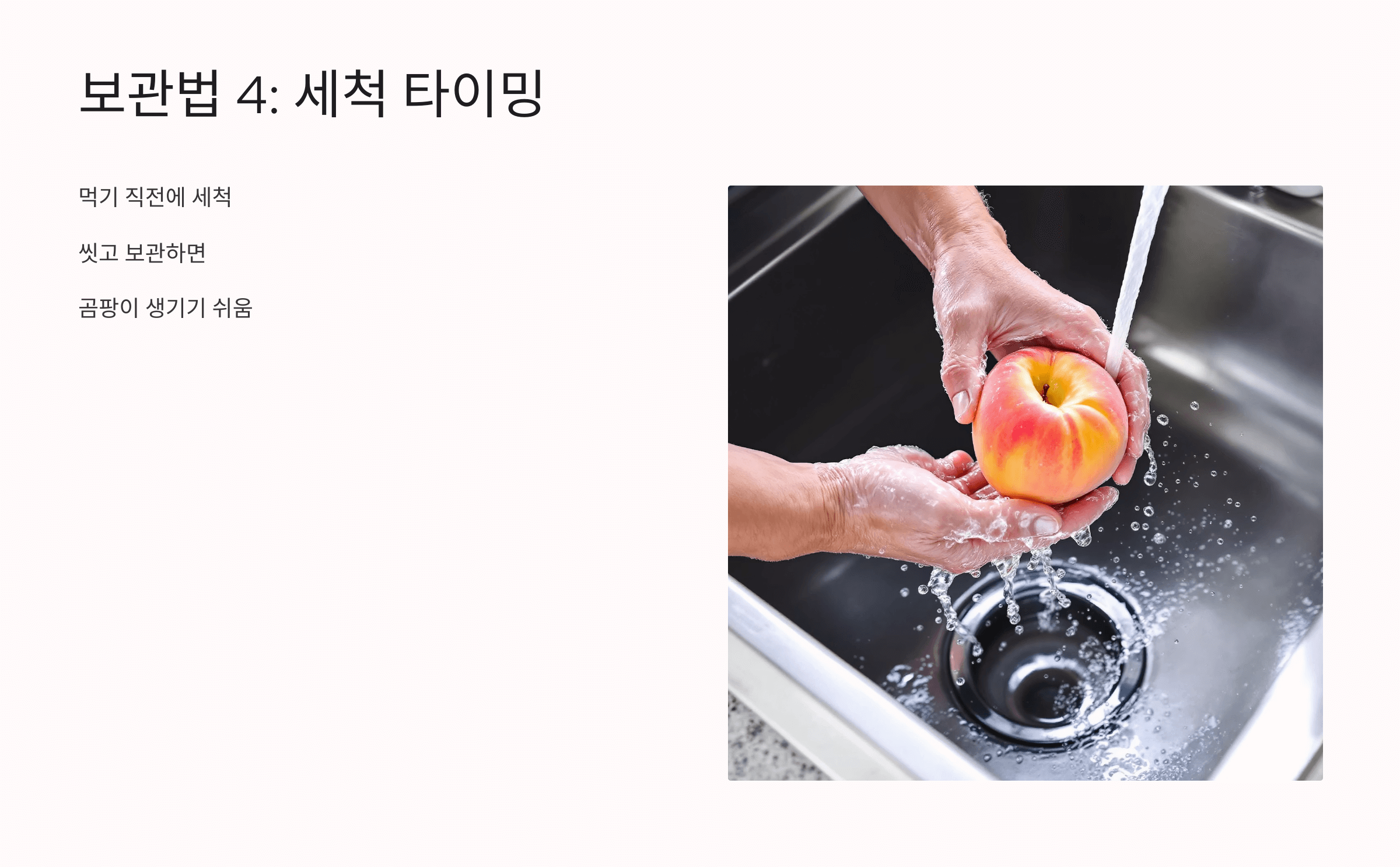 - 세척은 먹기 직전에!: 씻고 나서 보관하면 곰팡이 생기기 쉬워요