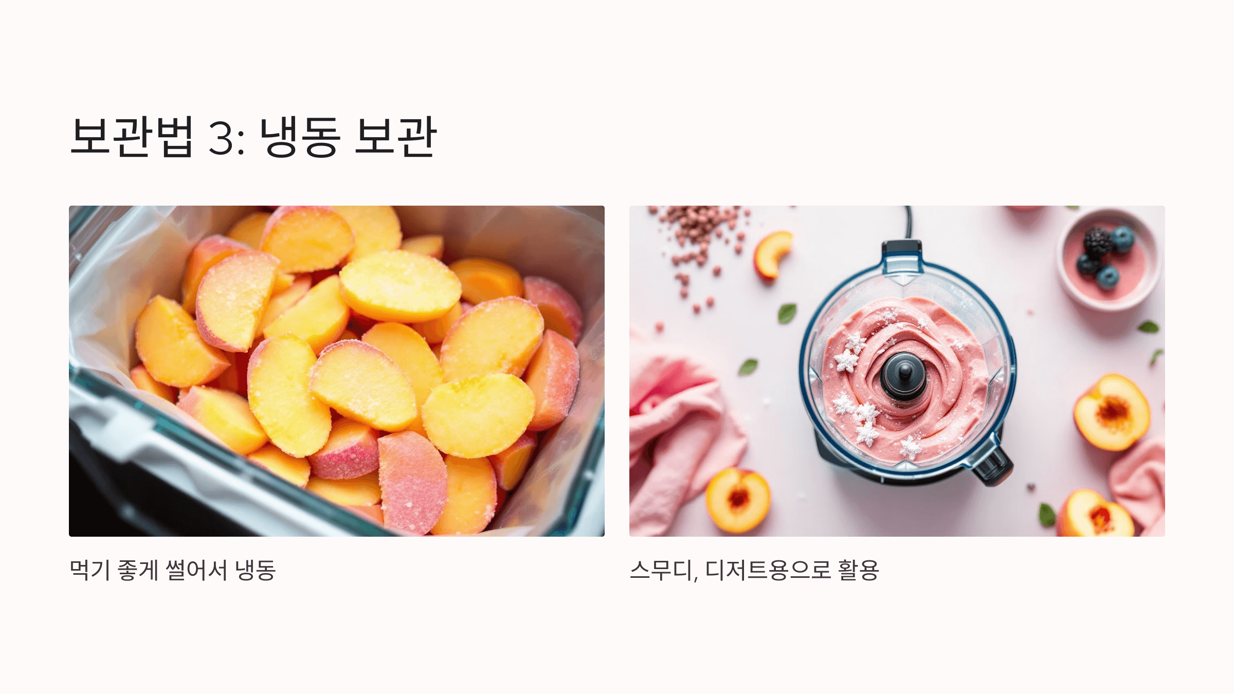 과일 칸에서 3~5일 이내 섭취 - 냉동 보관: 먹기 좋은 크기로 썰어 냉동하면 스무디, 샐러드, 디저트용으로 활용 가능