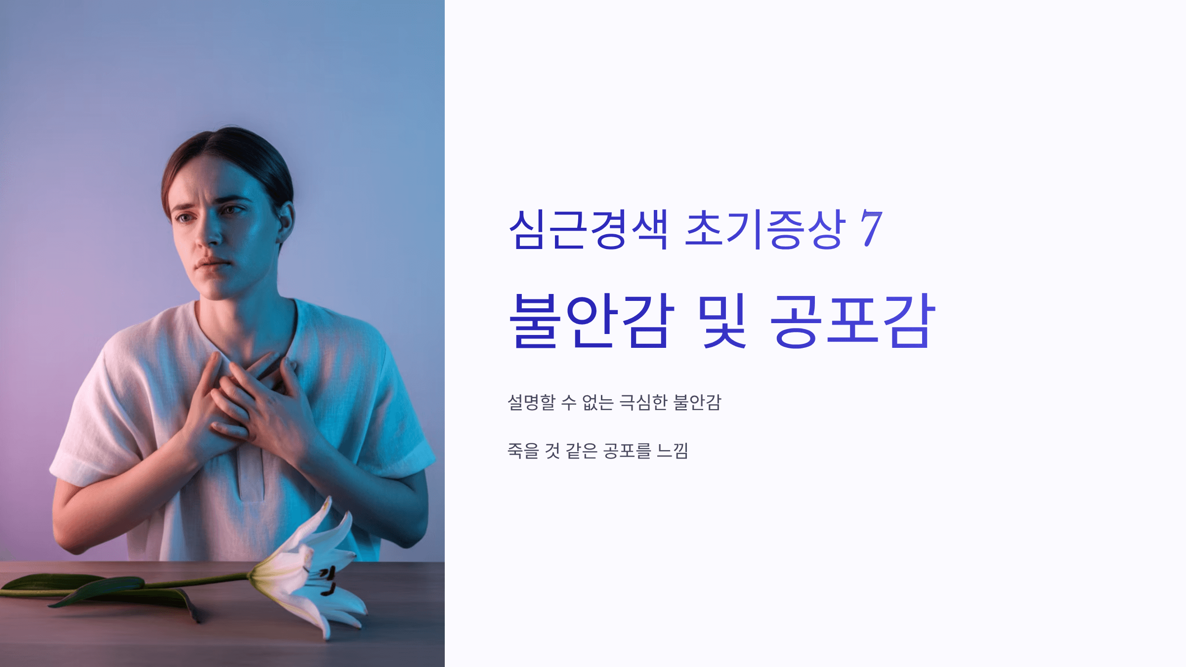 심근경색 환자들은 설명할 수 없는 극심한 불안감과 죽을 것 같은 공포를 느끼는 경우가 많습니다.