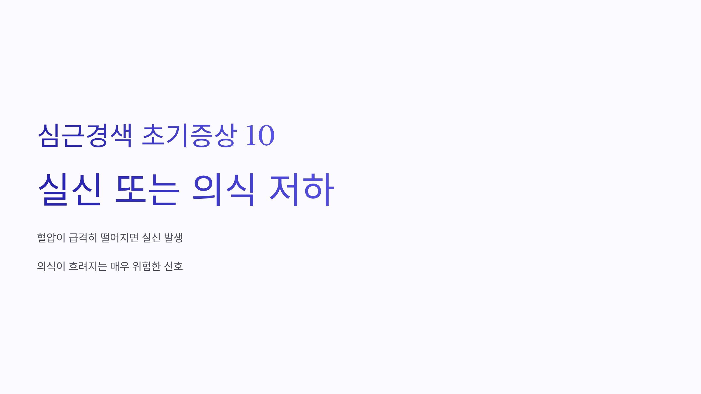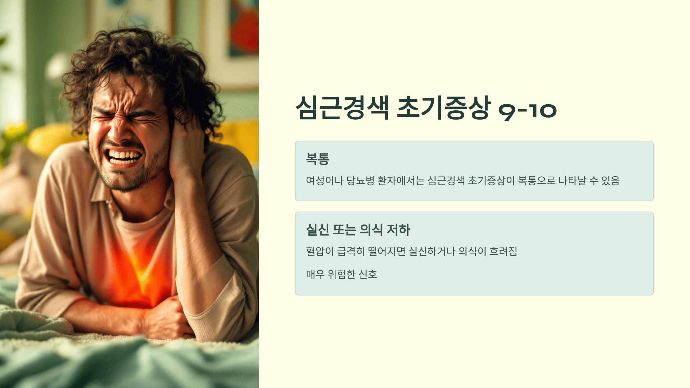 심근경색으로 혈압이 급격히 떨어지면 실신하거나 의식이 흐려지는 경우도 있습니다. 매우 위험한 신호입니다.