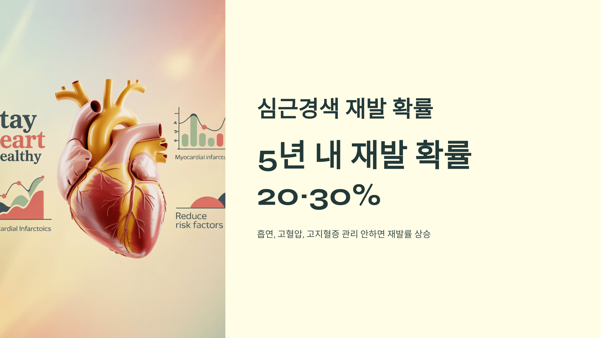 - 첫 심근경색 발생 후 5년 내 재발 확률은 20~30%
