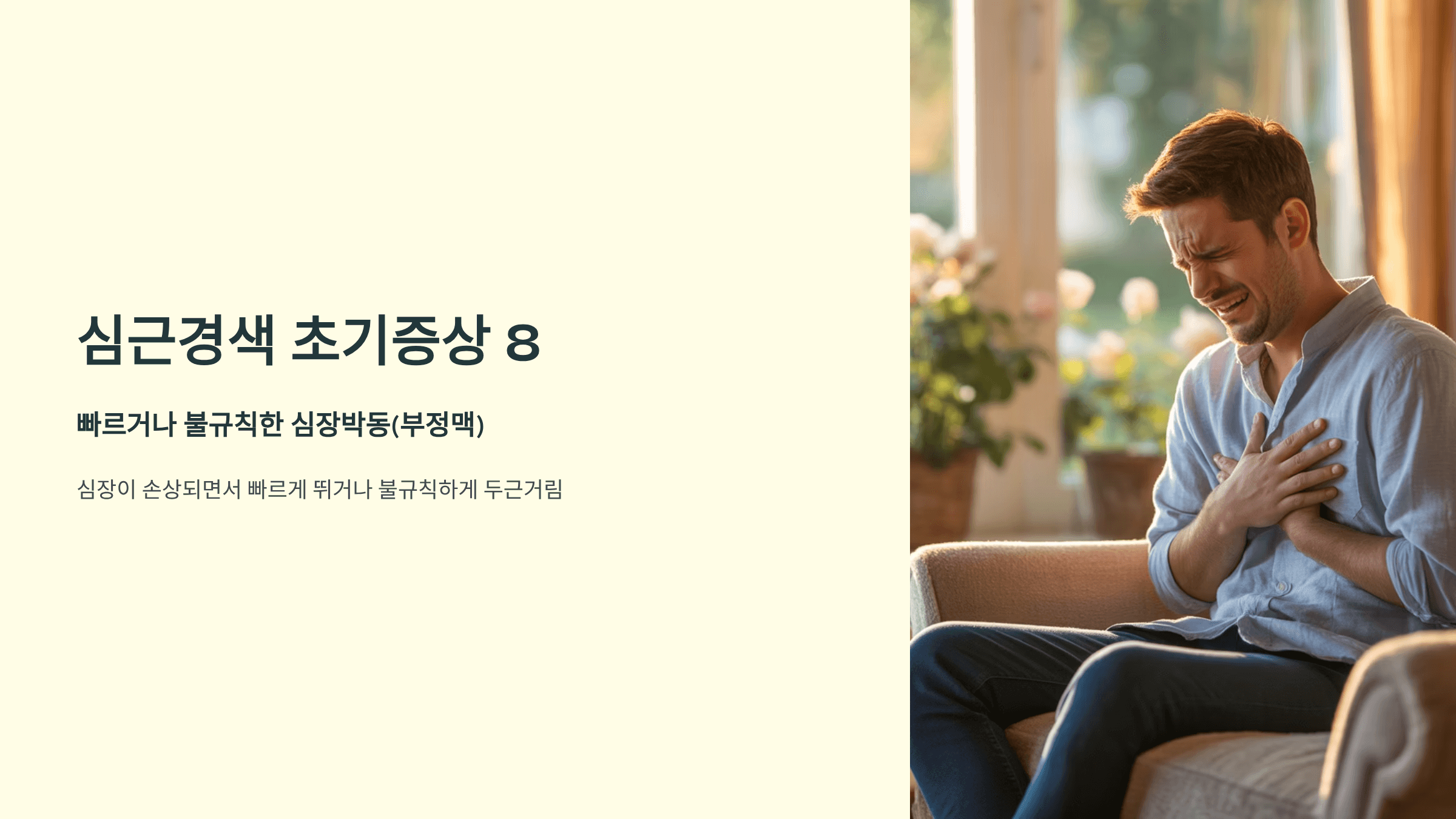심근경색으로 심장이 손상되면서 심장이 빠르게 뛰거나 불규칙하게 두근거리는 증상이 나타납니다.