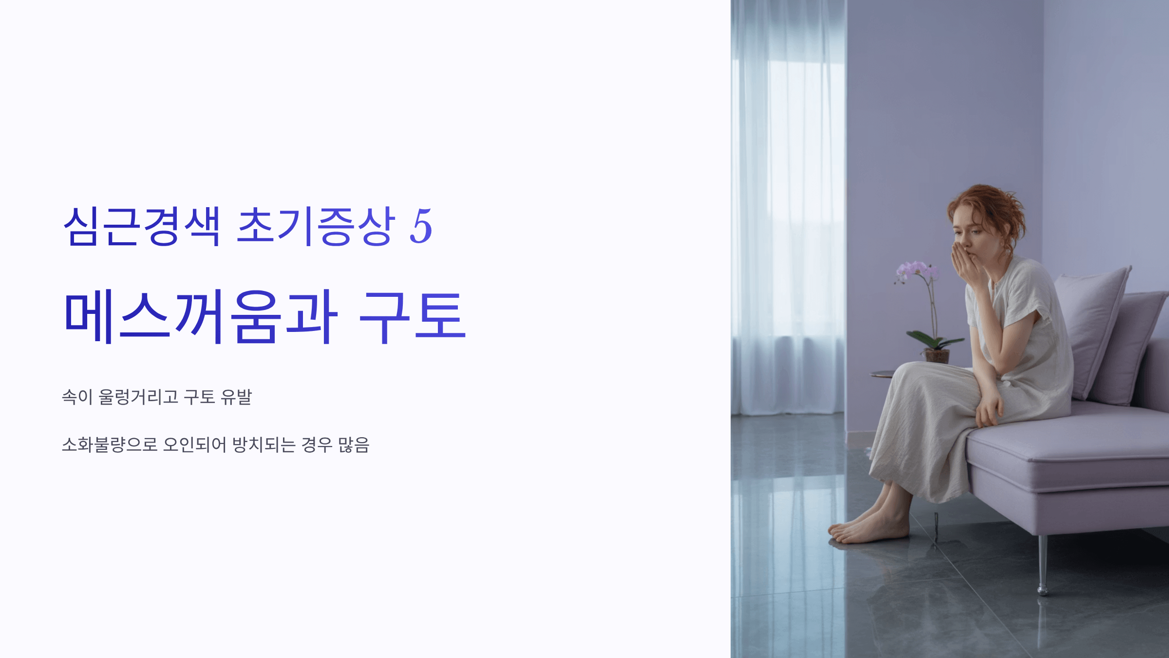 소화불량과 비슷하게 속이 울렁거리고 구토를 유발하는 경우도 있습니다. 심근경색 증상이 소화불량으로 오인되어 방치되는 경우가 많아 주의가 필요합니다.