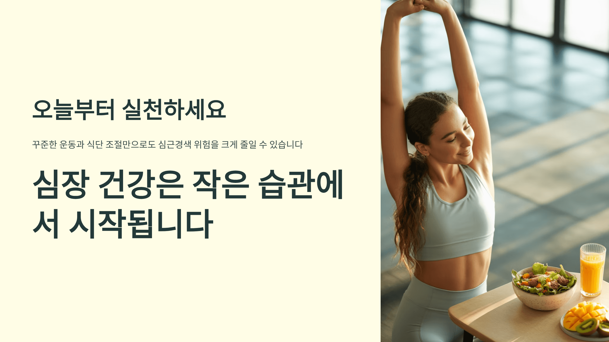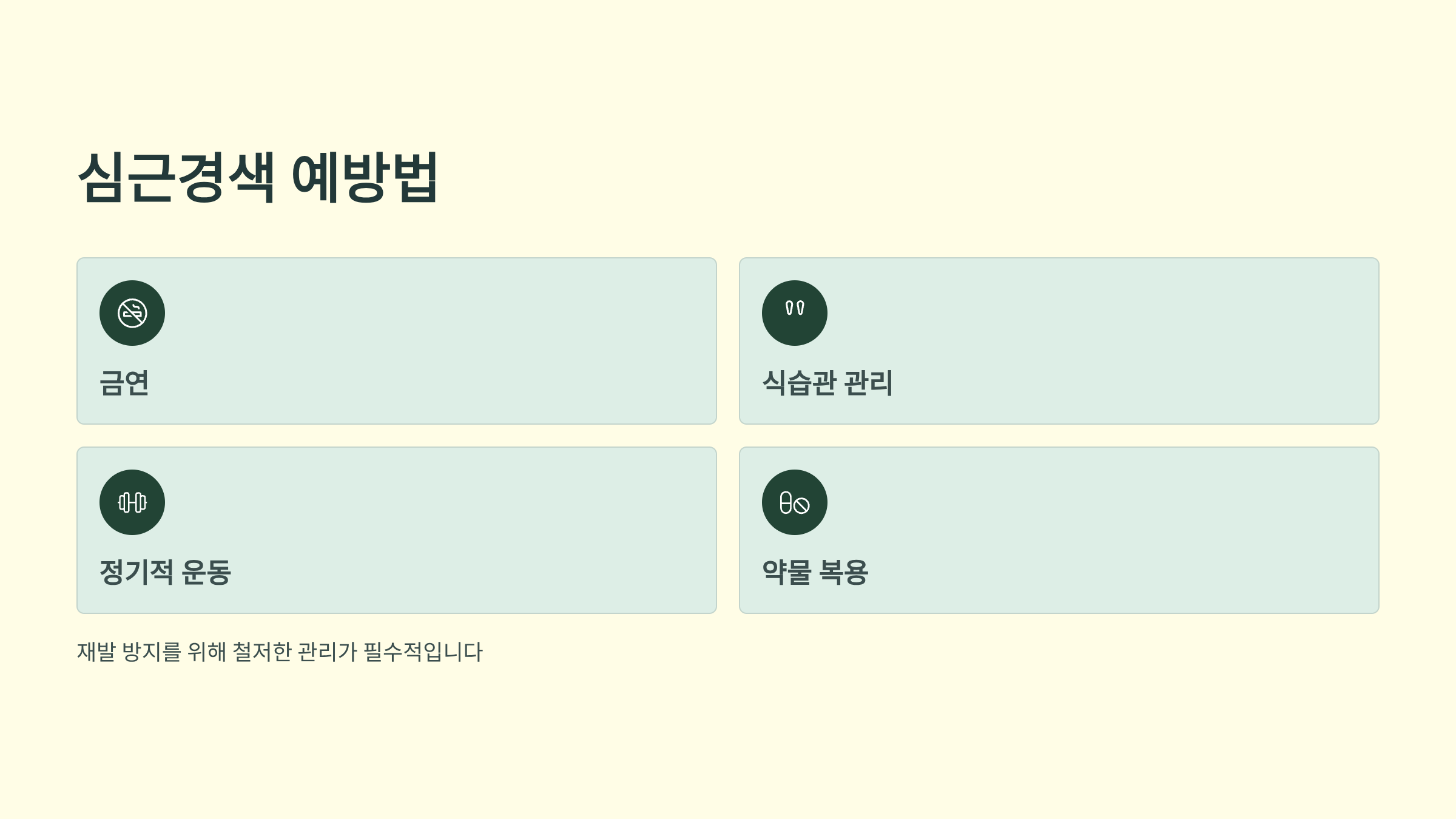 금연, 절주, 혈압과 혈당 관리, 꾸준한 운동, 건강한 식습관이 심근경색 예방의 핵심입니다.