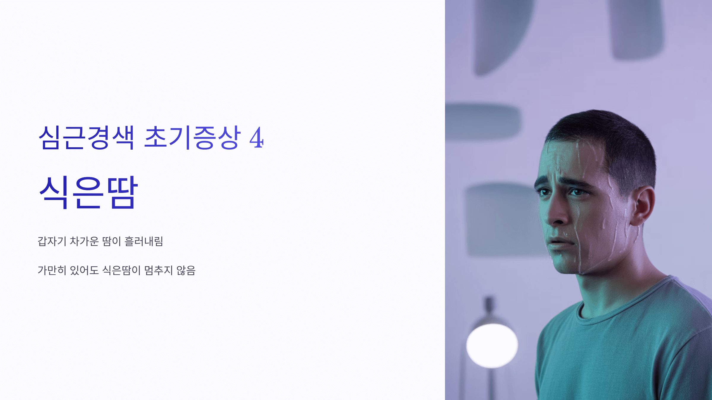 갑자기 차가운 땀이 흘러내리는 현상도 심근경색 초기증상 중 하나입니다. 특히 가만히 있어도 식은땀이 멈추지 않는다면 심장 문제를 의심해야 합니다.