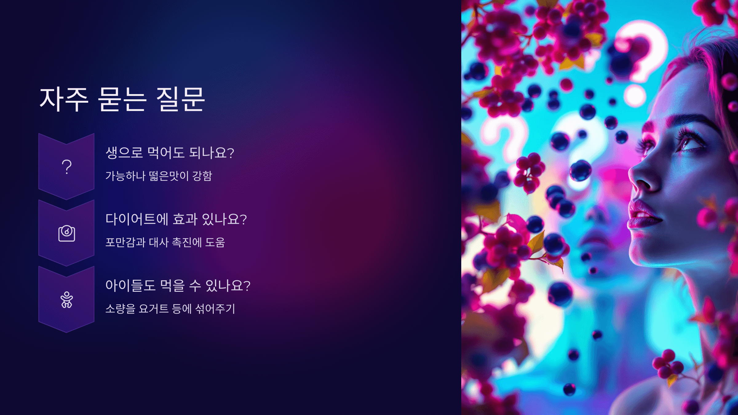 → 포만감과 대사 촉진에 도움돼요. 꾸준히 섭취하면 체중 관리에 좋아요. - 아로니아는 어떤 맛인가요?