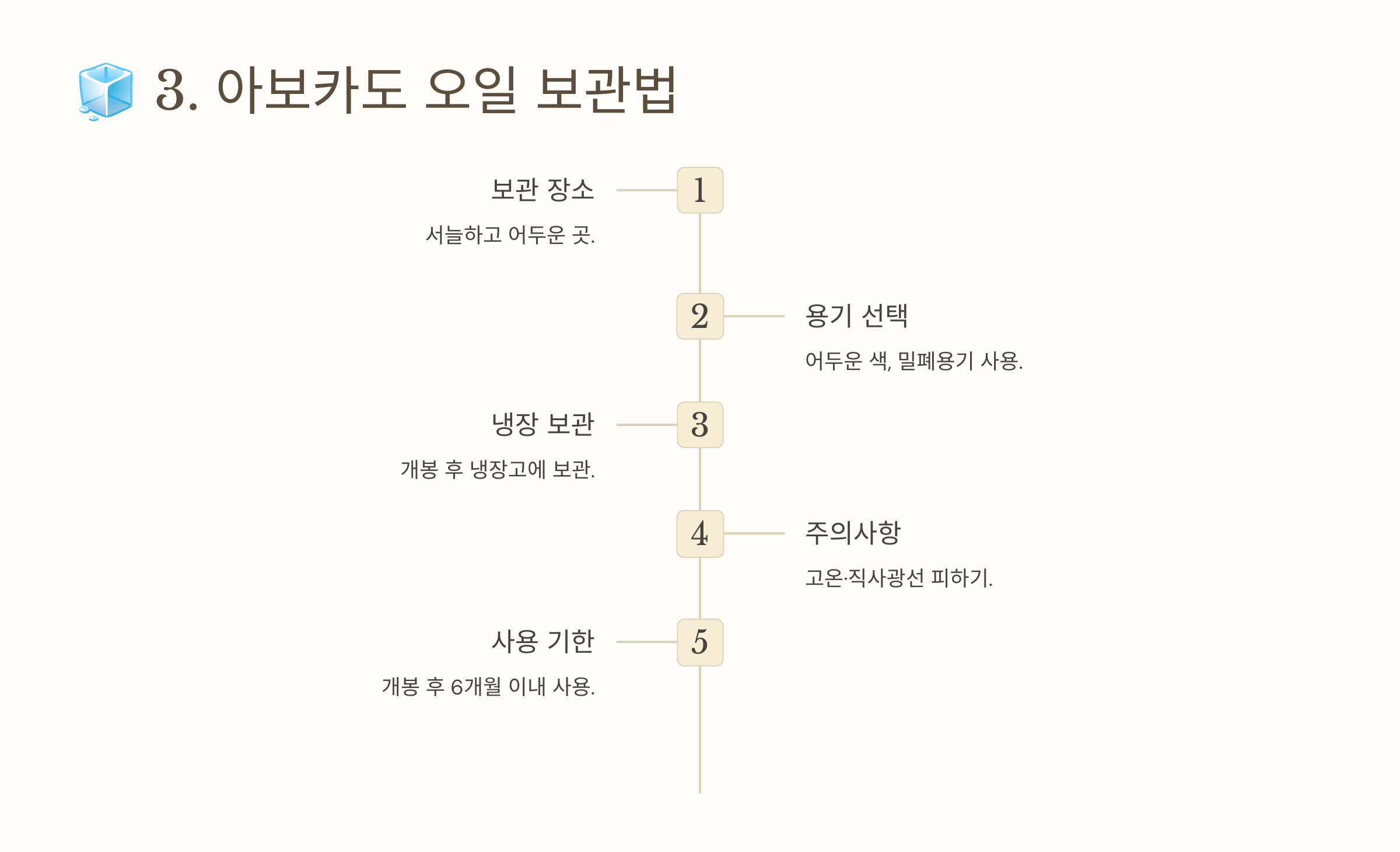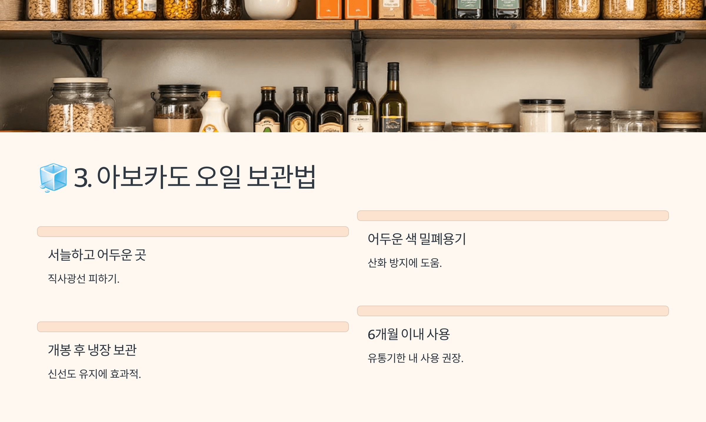 아보카도 오일은 발연점이 높고, 맛이 담백해 고온 요리에 더 적합해요. - 오래 보관해도 괜찮을까요?