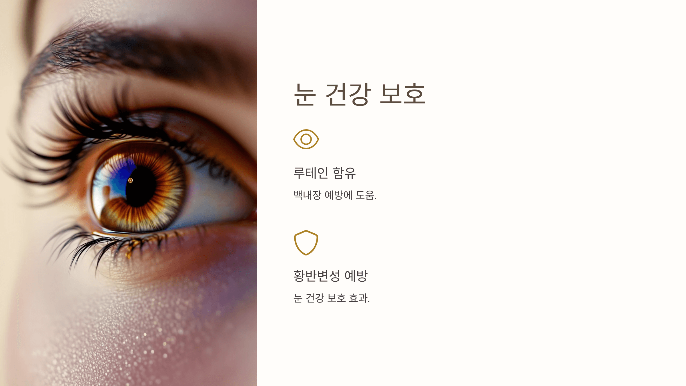 눈의 피로를 줄이고 백내장·황반변성 예방에 도움을 줍니다.
