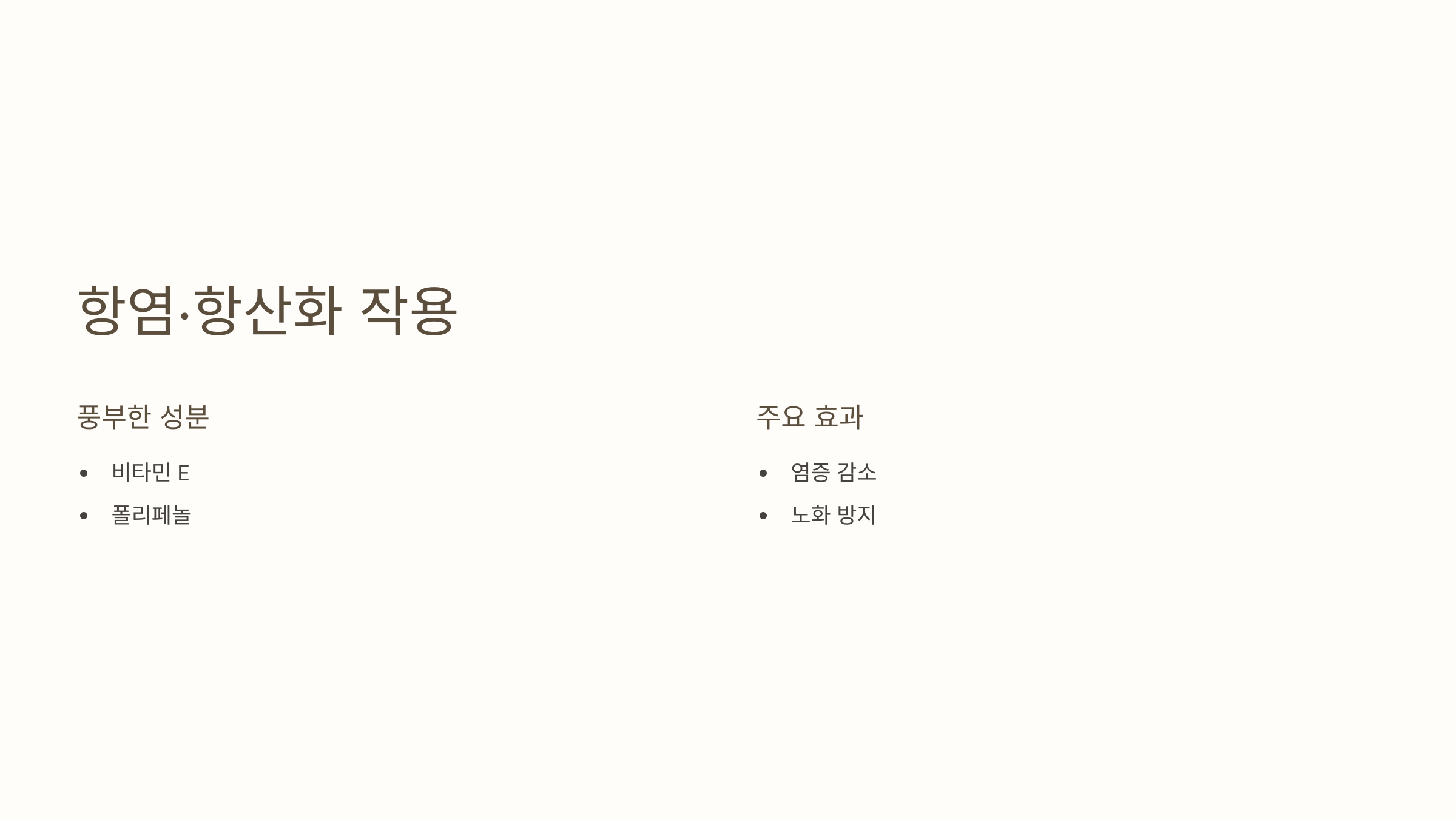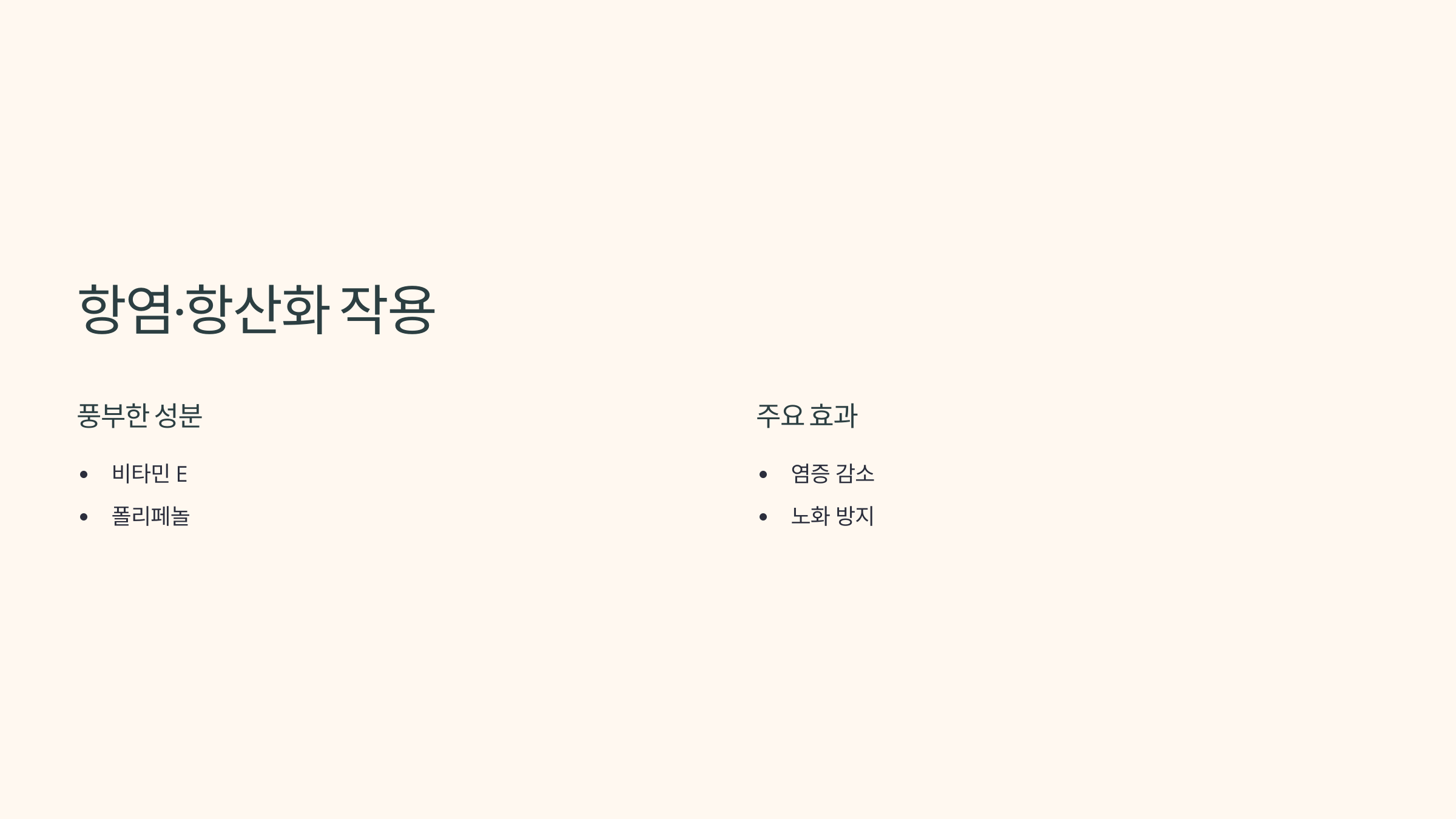 비타민 E와 폴리페놀이 풍부해서 세포 노화 방지, 염증 완화에 탁월해요.
