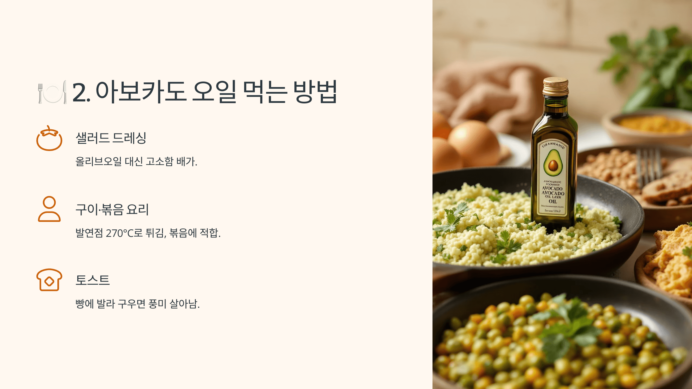 - 아보카도 오일 토스트: 빵에 발라 구우면 풍미가 살아나요.