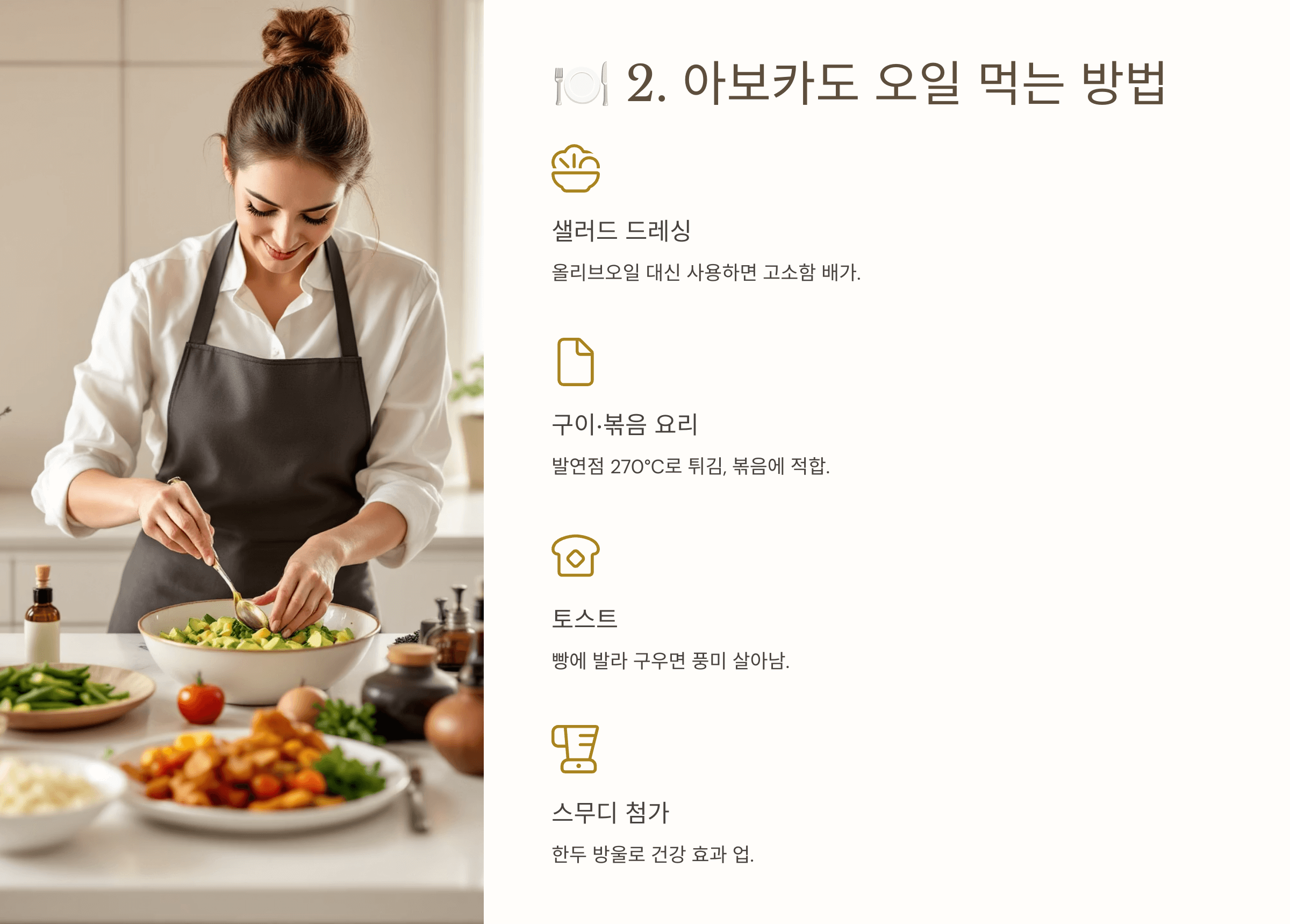 - 샐러드 드레싱: 올리브오일 대신 아보카도 오일로 바꾸면 고소함이 배가 돼요.