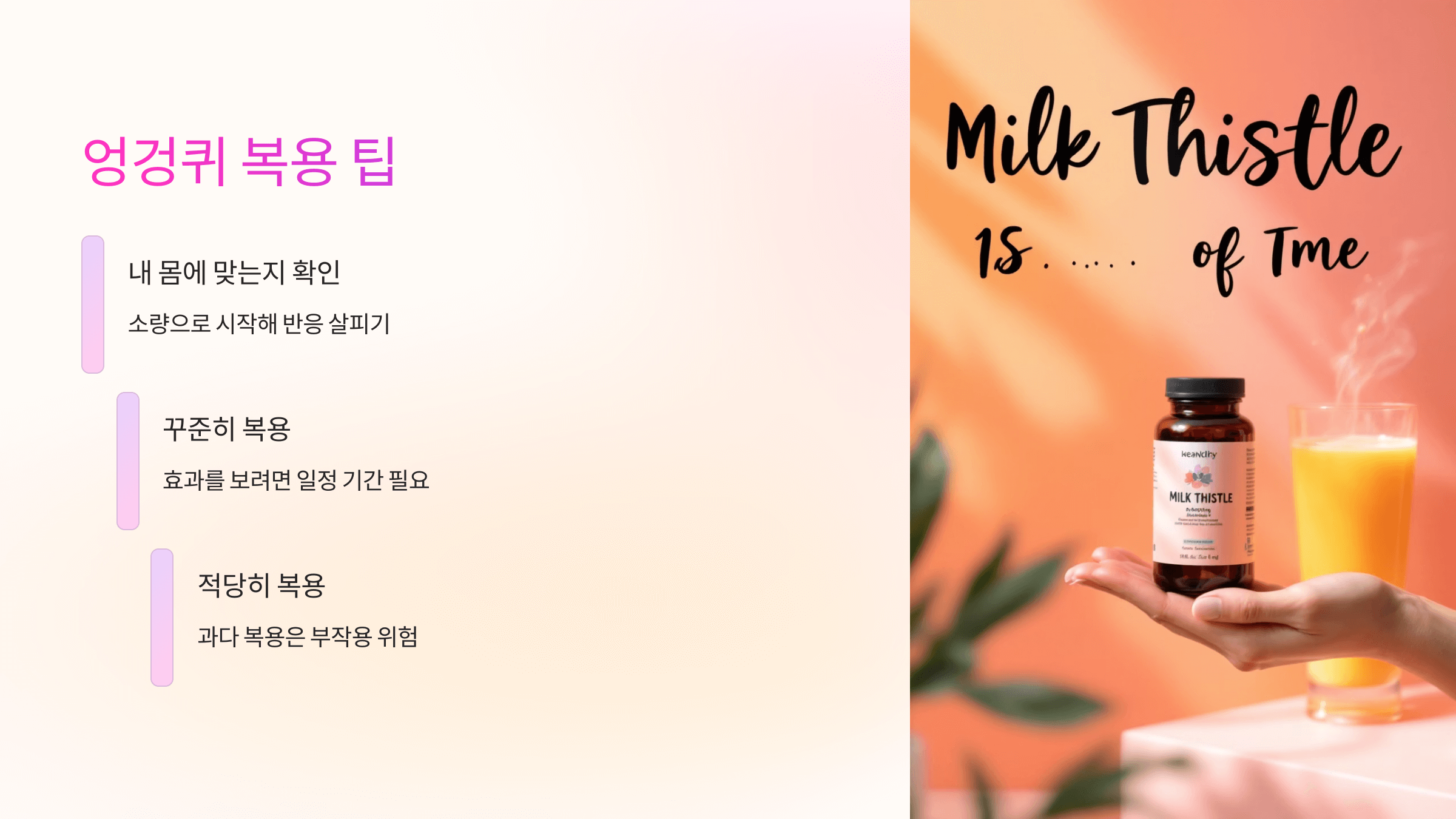 → 일반적으로 실리마린 기준 200~400mg, 하루 2~3번 나눠 복용이 좋아요.