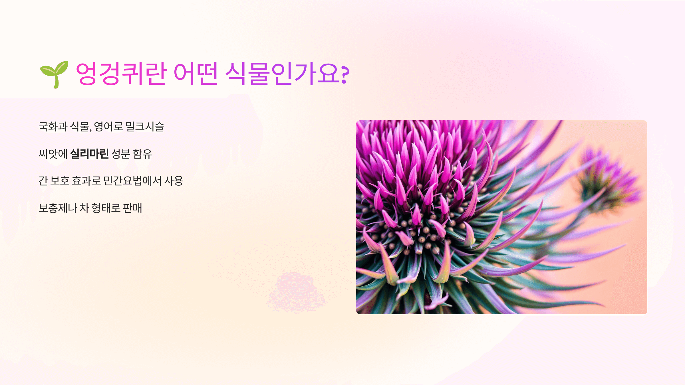 엉겅퀴는 국화과 식물로, 영어로는 밀크시슬(Milk Thistle)이라고 불려요.