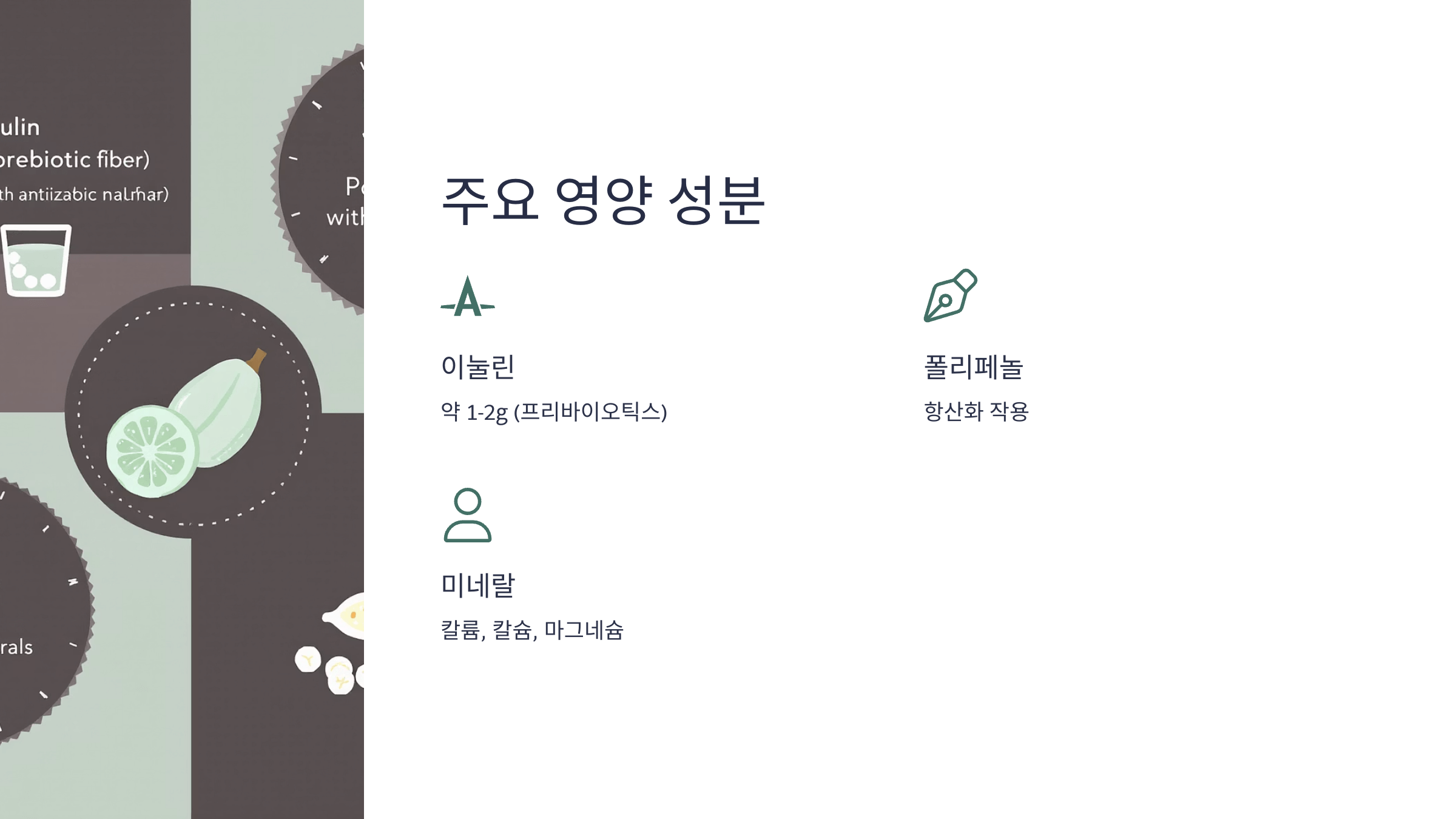 - 이눌린: 약 1–2g (프리바이오틱스 역할)