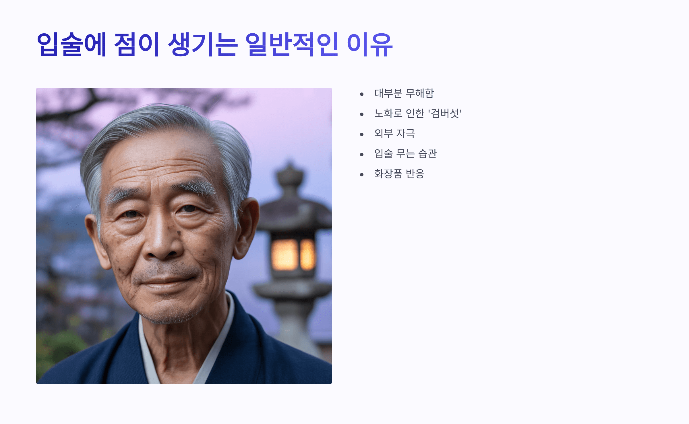 입술에 생기는 점은 대부분 무해한 경우가 많습니다. 특히 나이가 들면서 자연스럽게 나타나는 경우도 있죠. 흔히 '검버섯'이라고 불리는 노화성 색소성 병변이 입술에 생기는 경우도 있어요. 또한 외부 자극, 입술을 무는 습관, 특정 화장품 사용 등이 반복되면서 피부가 반응하는 경우도 있어요. 저도 예전에 립밤을 자주 바꾸다가 작은 점이 생긴 적이 있었거든요. 일상 습관 하나가 피부에 큰 영향을 줄 수 있답니다.
