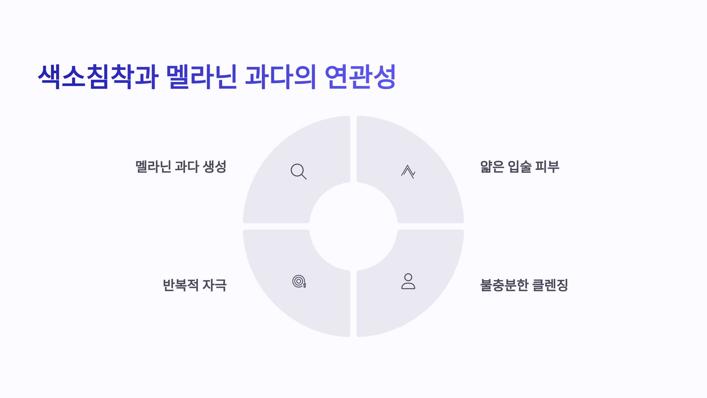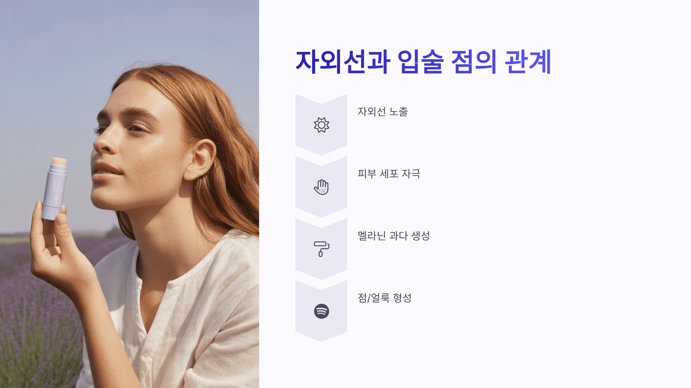 피부에 점이 생긴다는 건, 멜라닌이라는 색소가 과하게 생성됐다는 신호일 수 있어요. 멜라닌은 자외선 차단이나 피부 보호에 중요한 역할을 하지만, 균형이 깨지면 색소침착이 생깁니다. 특히 입술처럼 피부가 얇고 예민한 부위는 색소 침착에 민감하죠. 화장을 지울 때 클렌징이 부족하거나, 입술에 자극이 자주 가해지면 이런 현상이 더 잘 나타납니다. 피부는 참 솔직해서, 관리하는 만큼 보답을 해주는 것 같아요!