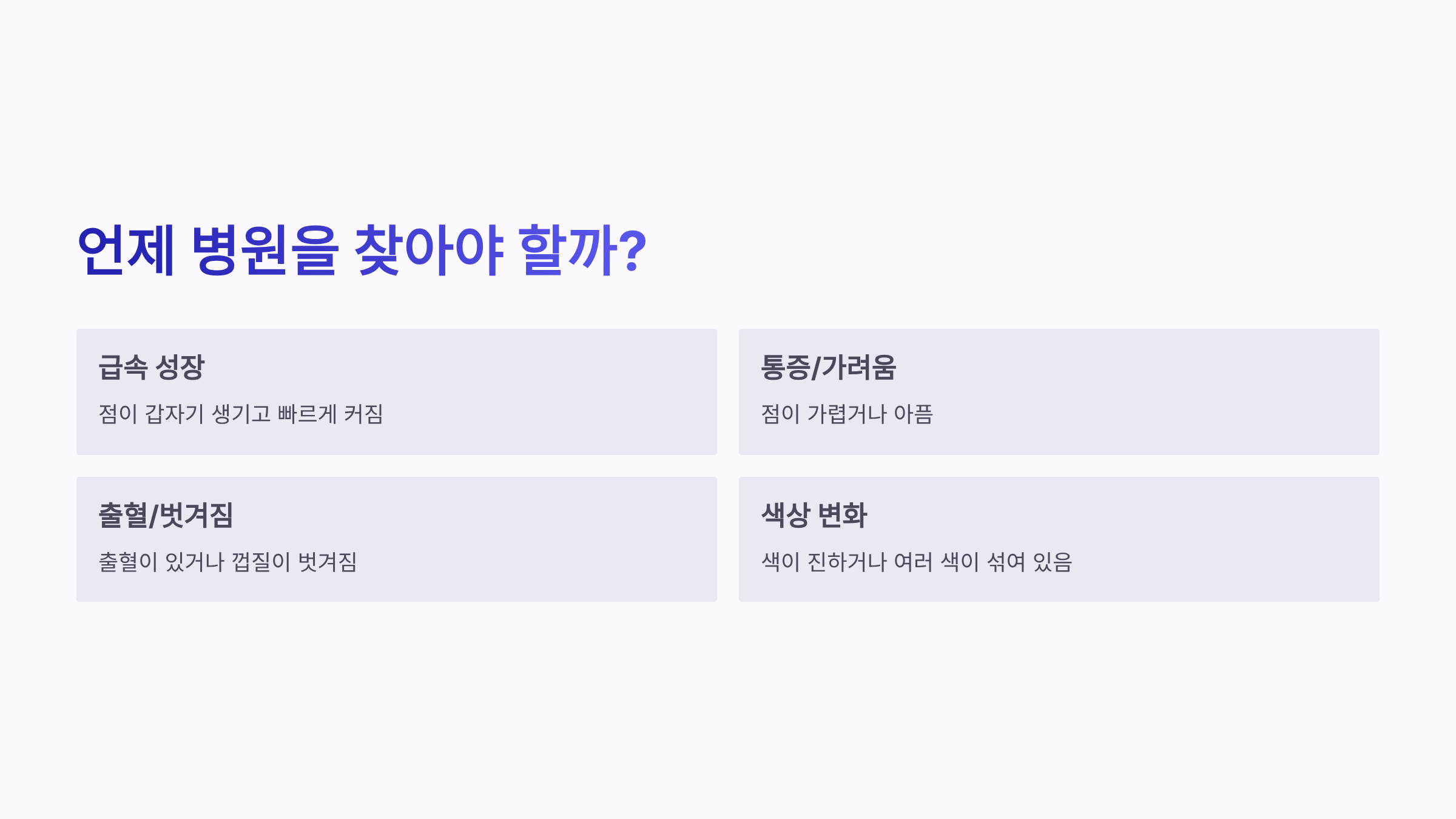 대부분의 점은 문제가 되지 않지만, 가끔은 피부암이나 기타 피부 질환의 초기 신호일 수 있어요. 특히 점의 모양이 비대칭이거나, 경계가 불분명하거나, 갑자기 크기가 커지거나 색이 진해질 경우엔 반드시 병원 진단을 받아야 해요. 이런 점은 '악성 흑색종'의 징후일 수도 있거든요. 건강한 피부를 유지하기 위해선 정기적인 점검이 중요합니다.