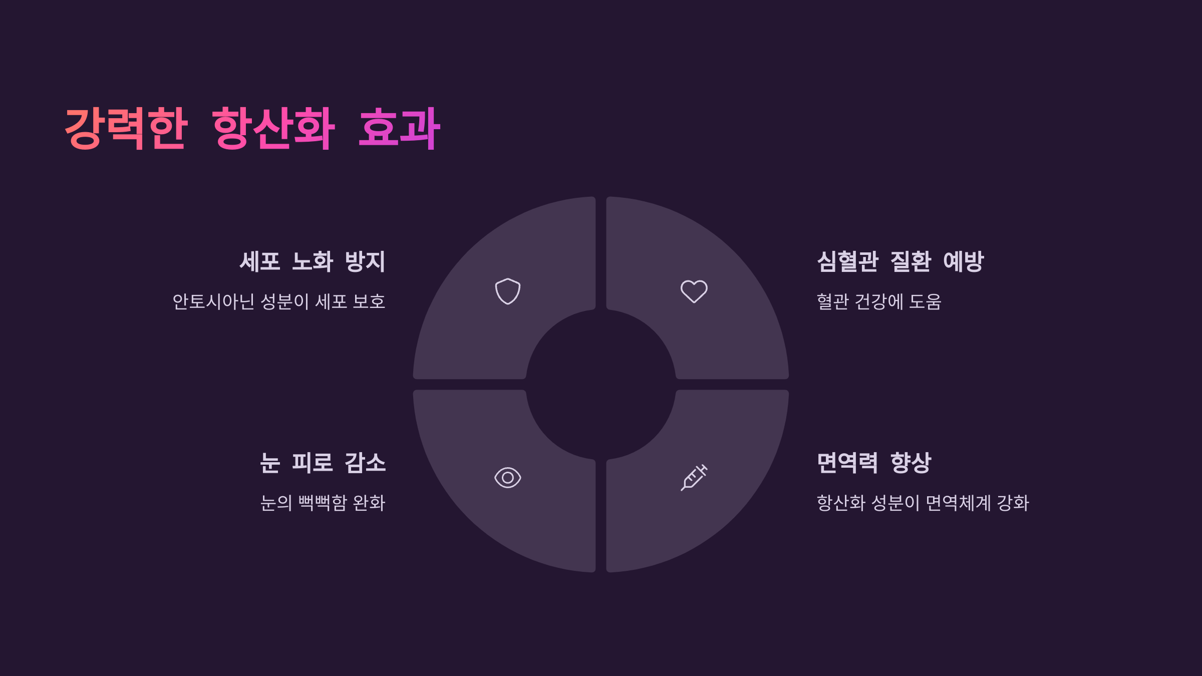 이 성분은 세포 노화 방지, 면역력 향상, 심혈관 질환 예방에도 도움을 줘요.
