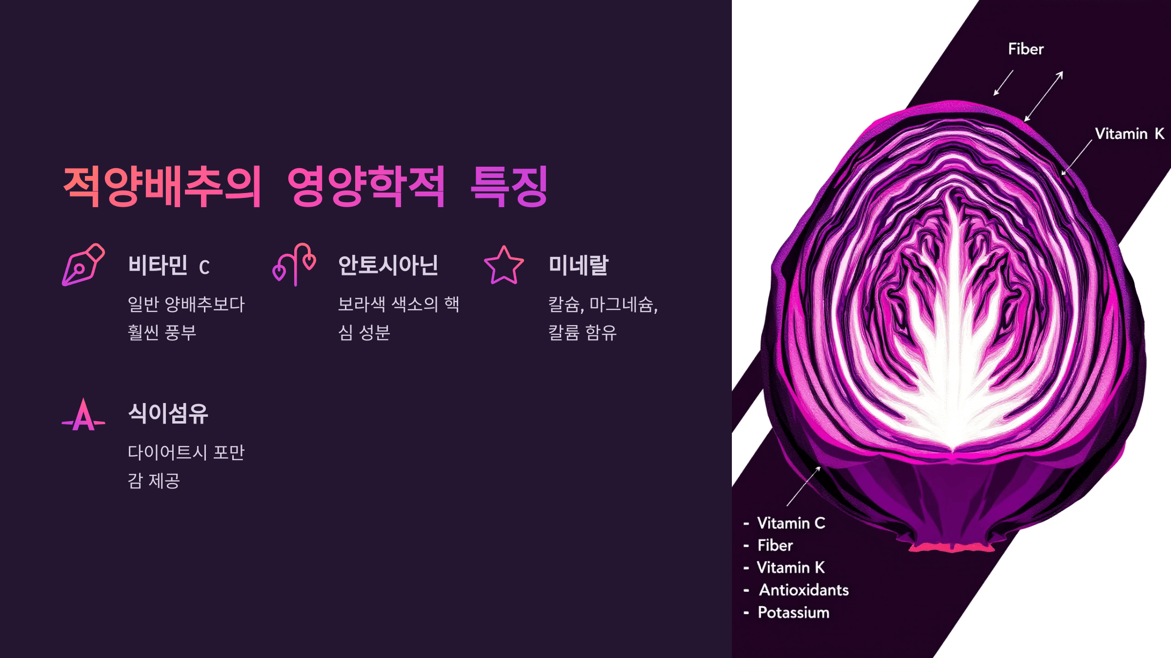 적양배추는 안토시아닌이라는 항산화 성분이 풍부해 일반 양배추보다 노화 방지와 면역력 강화에 더 효과적이에요.