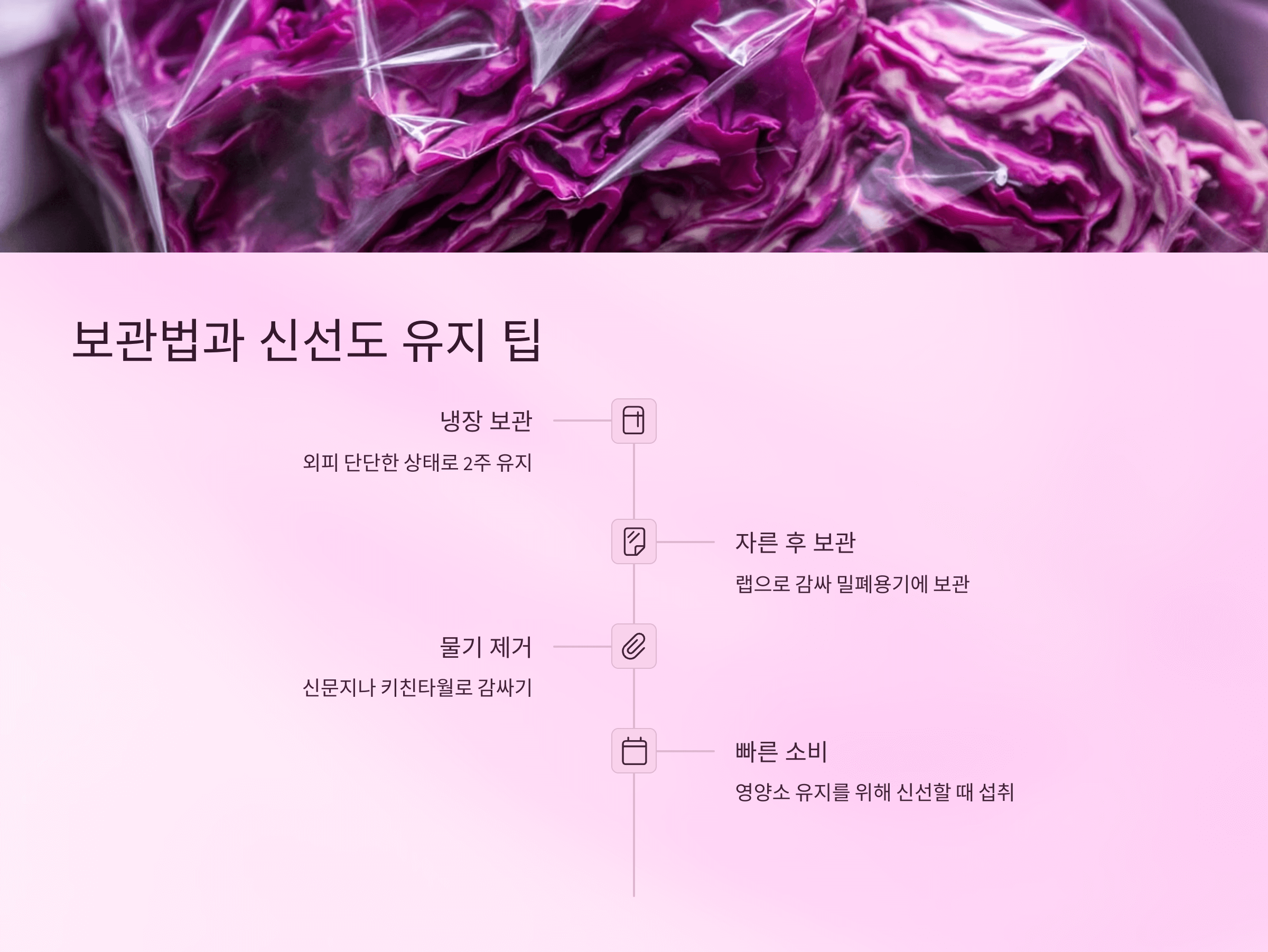 적양배추는 통째로 냉장 보관하면 2주 정도 신선하게 유지돼요.