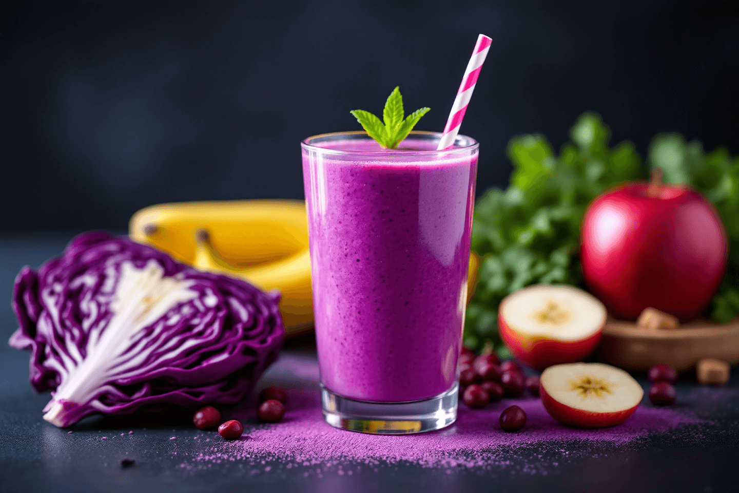 또한 적양배추 스무디에 바나나, 사과를 넣으면 달콤하면서도 개운한 건강음료 완성입니다.