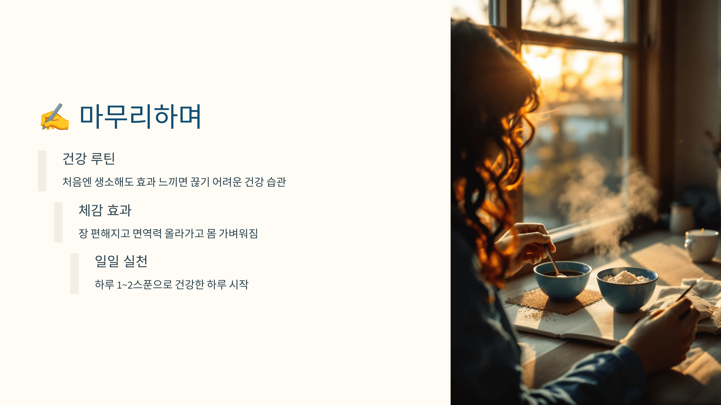 👉 성인 기준 하루 1~2스푼(약 15~30g)이 적당해요. 처음엔 소량부터 시작하세요.