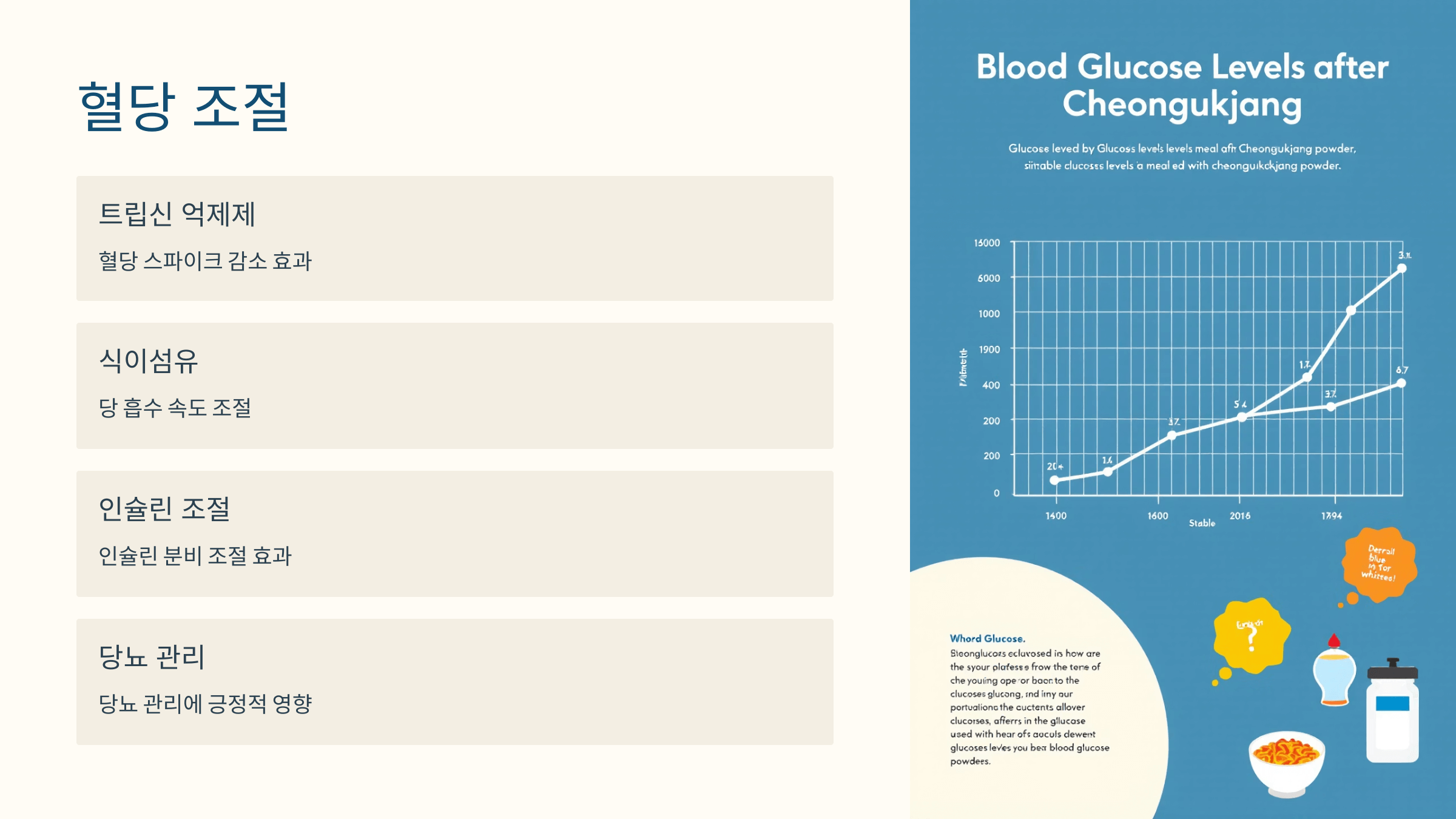 청국장가루에는 트립신 억제제, 식이섬유 등이 풍부해서 혈당 스파이크를 줄이고, 인슐린 분비를 조절해