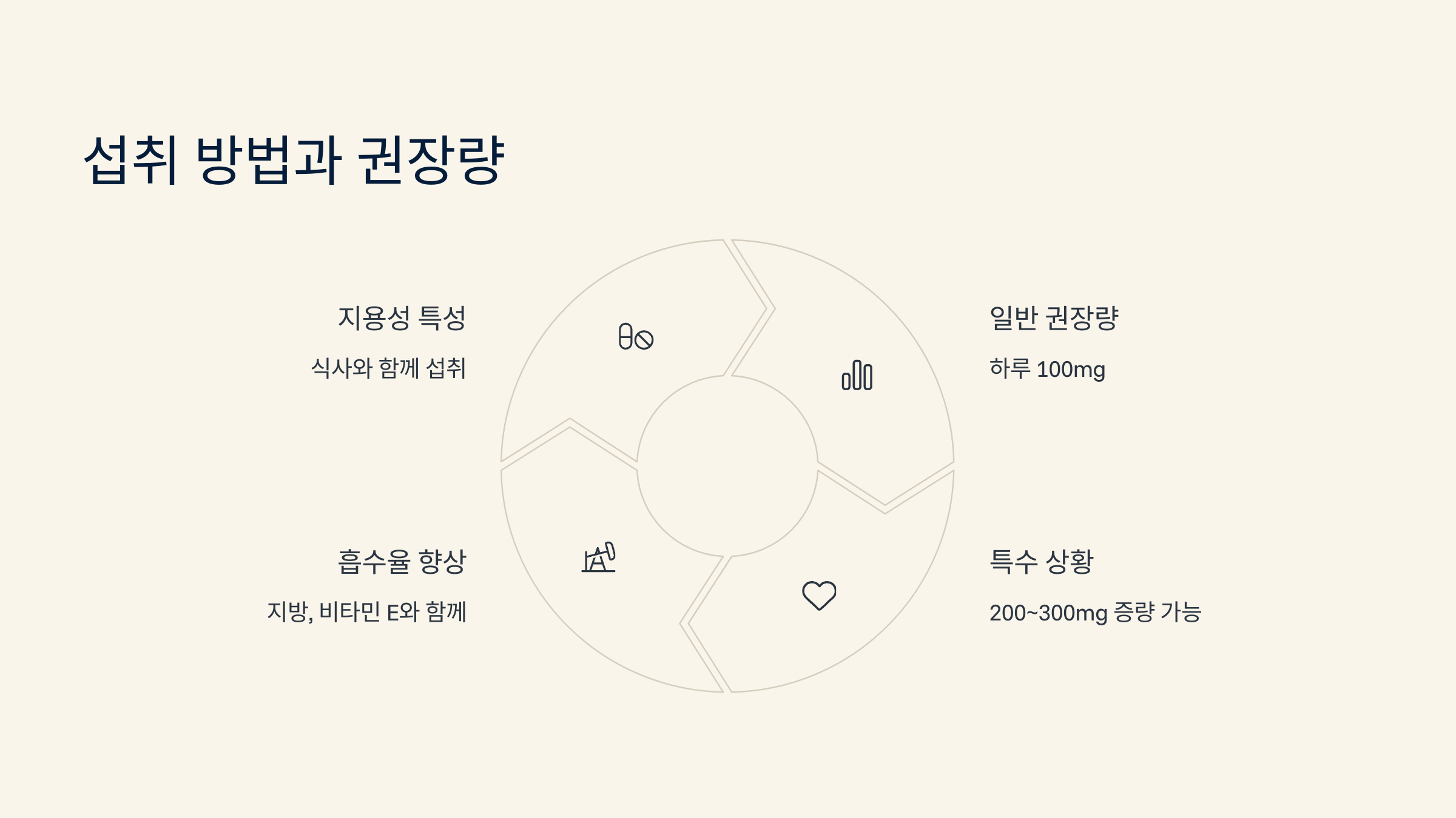 코엔자임 Q10은 지용성이므로 식사와 함께 섭취하는 것이 흡수율을 높이는 데 효과적입니다. 일반적인 권장 섭취량은 하루 100mg이며, 심장 질환 등의 특정 건강 상태에 따라 200~300mg까지 증량할 수 있습니다. 지방이 풍부한 음식이나 비타민 E와 함께 섭취하면 흡수율이 더욱 향상됩니다.