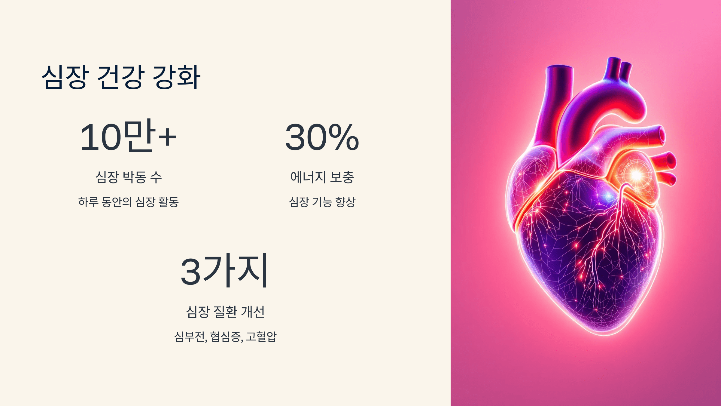 심장은 하루 10만 번 이상 뛰며 에너지를 많이 소모하는 기관인데, CoQ10이 그 에너지를 보충해줘요.