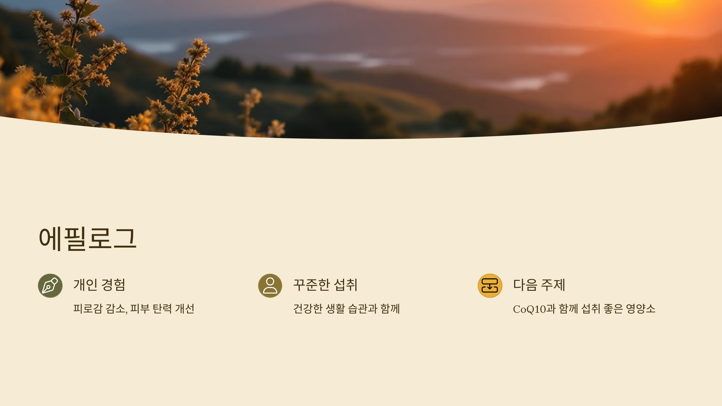 개인적으로 코엔자임 Q10을 섭취한 후 피로감이 줄고 피부 탄력이 개선되는 것을 느꼈습니다. 꾸준한 섭취와 함께 건강한 생활 습관을 유지하면 더욱 큰 효과를 기대할 수 있습니다. 다음 글에서는 코엔자임 Q10과 함께 섭취하면 좋은 영양소에 대해 알아보겠습니다!
