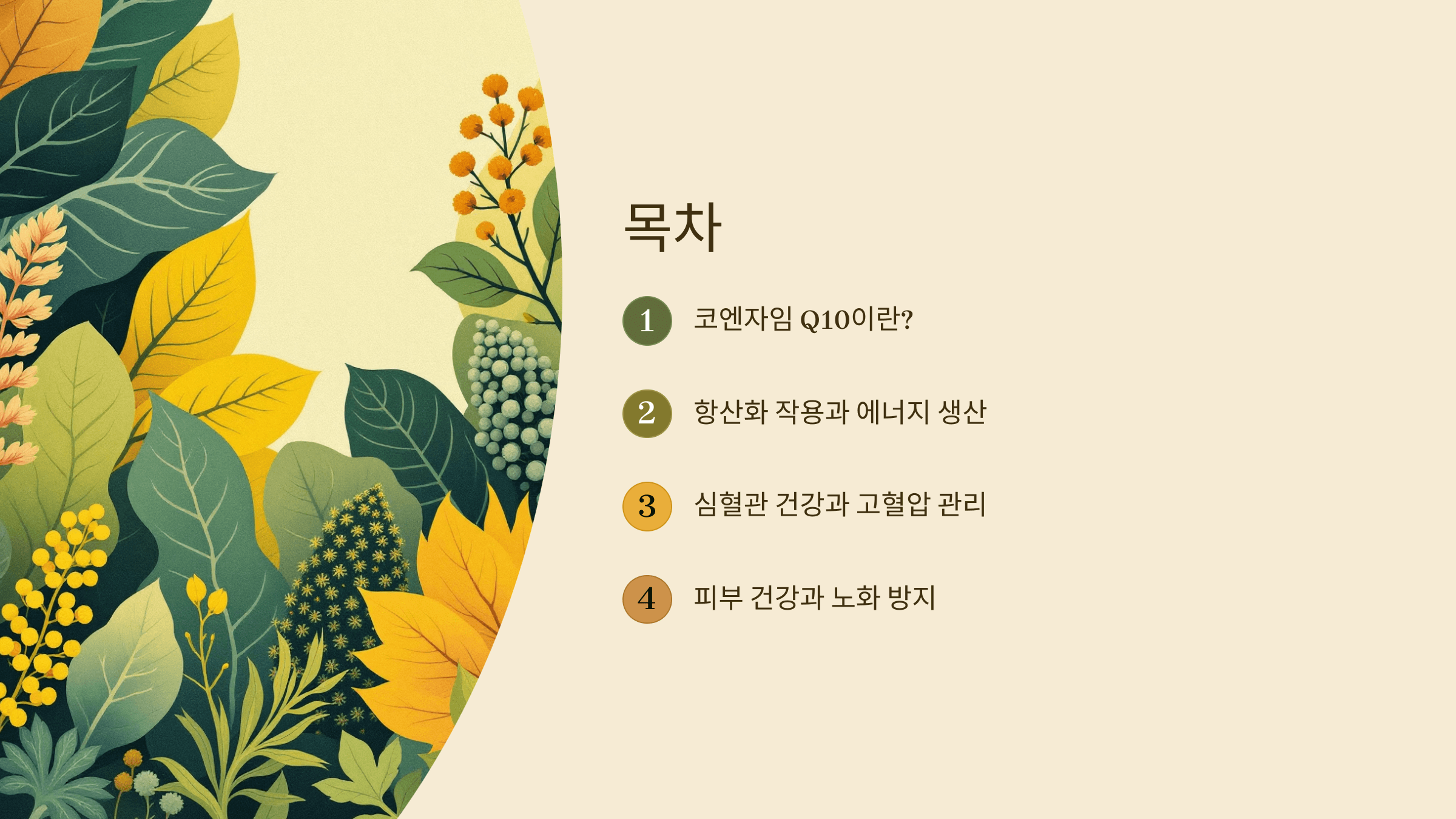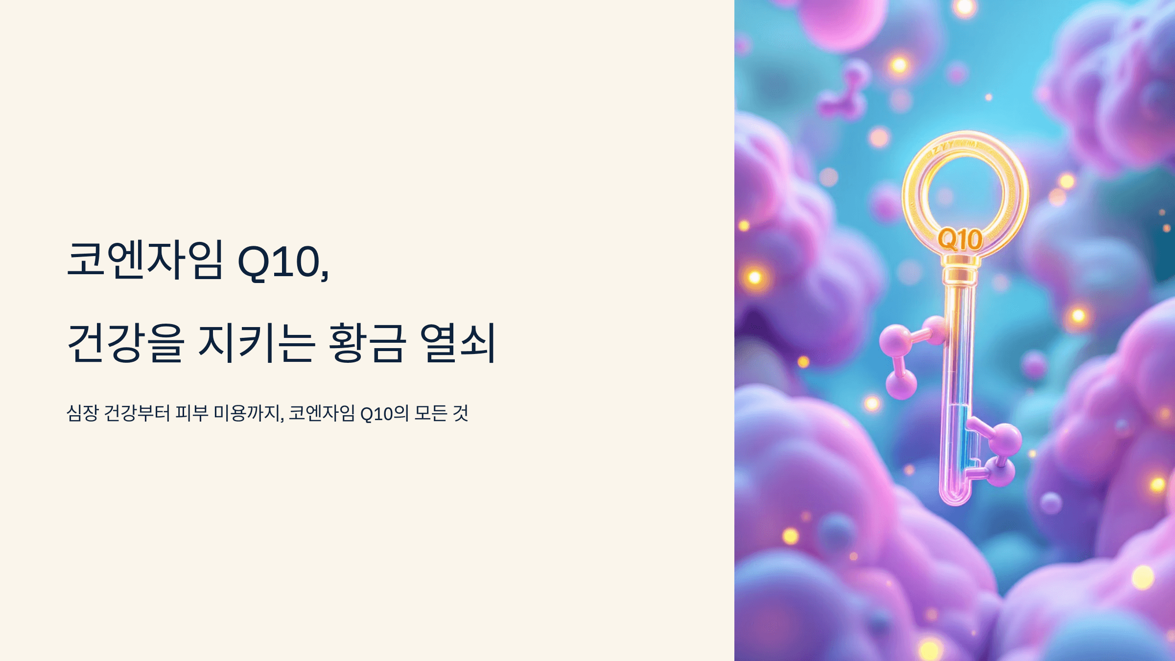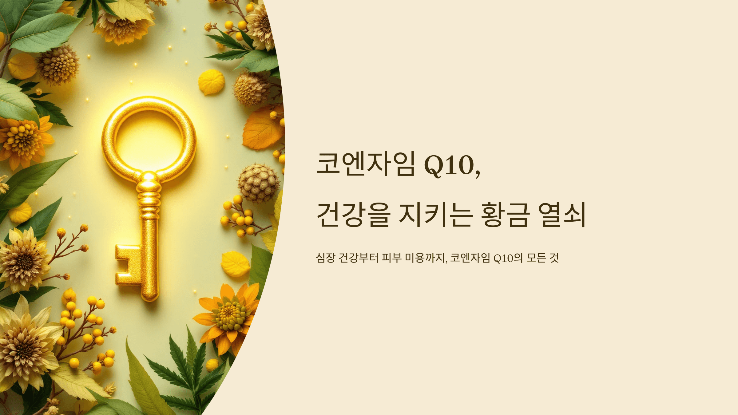 코엔자임 Q10(CoQ10)은 우리 몸에서 자연적으로 생성되는 지용성 비타민 유사 물질로, 세포 내 미토콘드리아에서 에너지 생산에 필수적인 역할을 합니다. 특히 심장, 간, 신장 등 에너지 소비가 많은 기관에 풍부하게 존재하며, 나이가 들수록 체내 생성량이 감소하여 외부 보충이 필요할 수 있습니다.