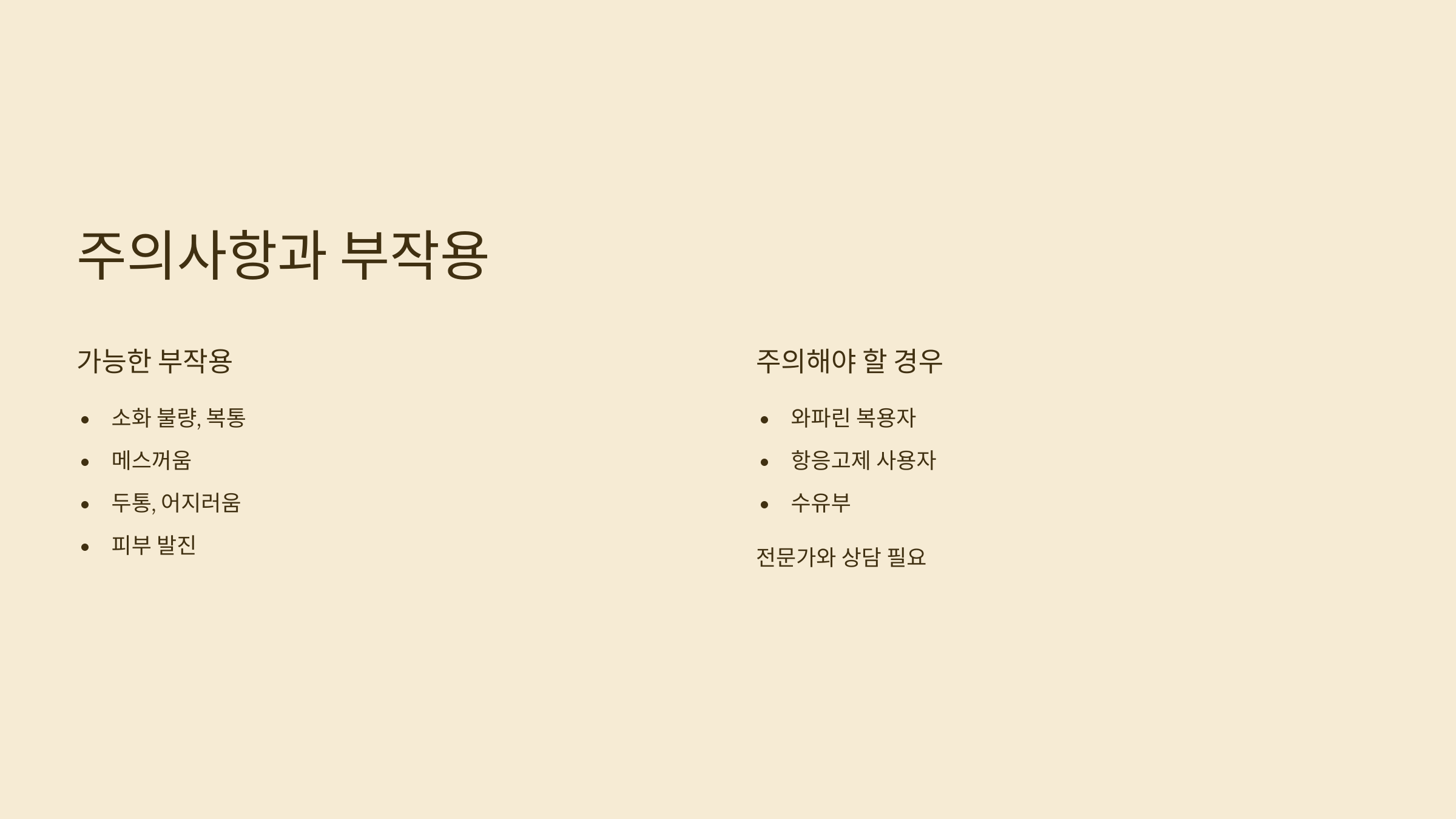 또한, 항응고제인 와파린을 복용 중인 경우 코엔자임 Q10이 약물의 효과를 감소시킬 수 있으므로 전문가와 상담이 필요합니다. 수유부는 섭취를 피하는 것이 권장됩니다.