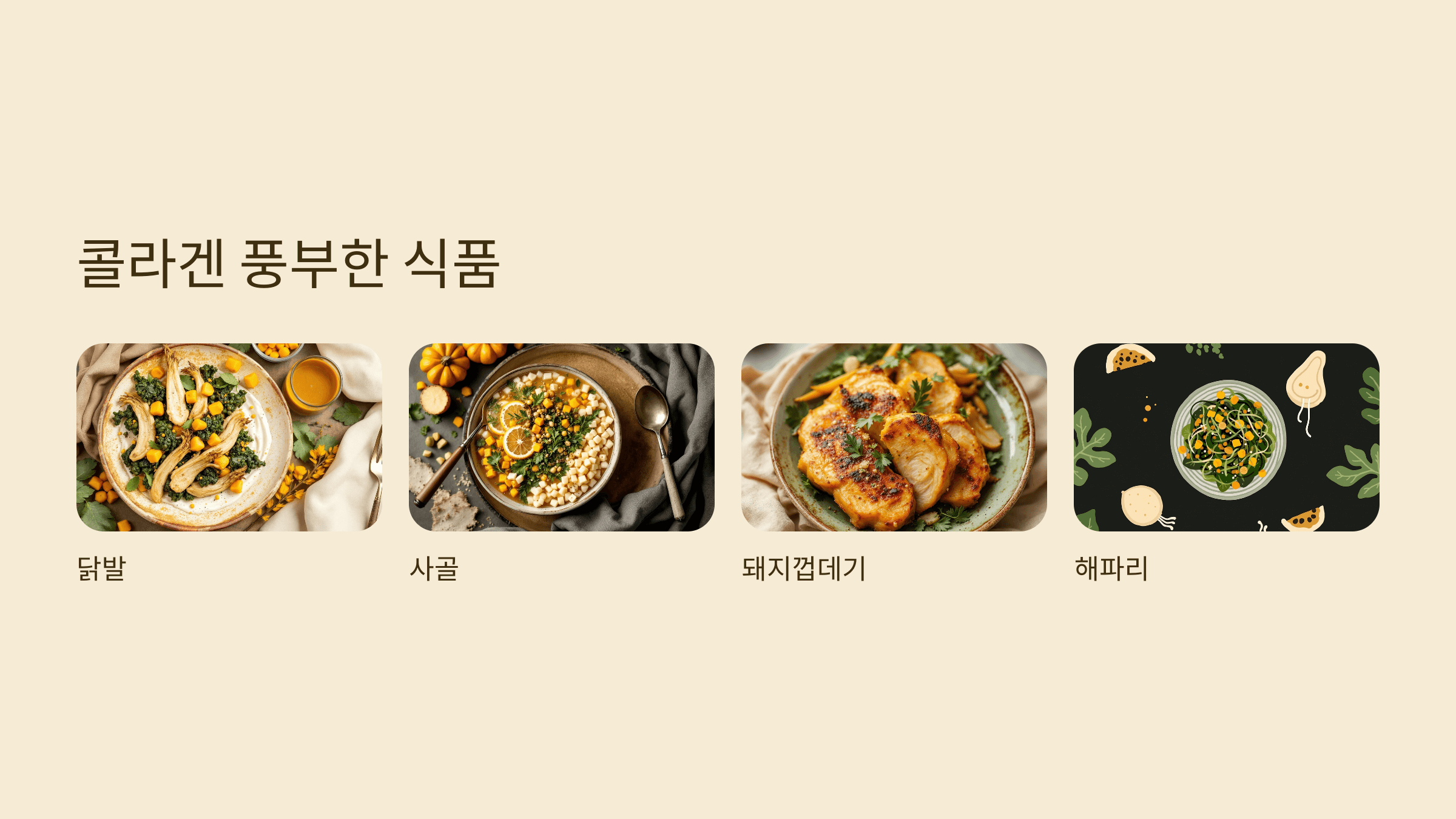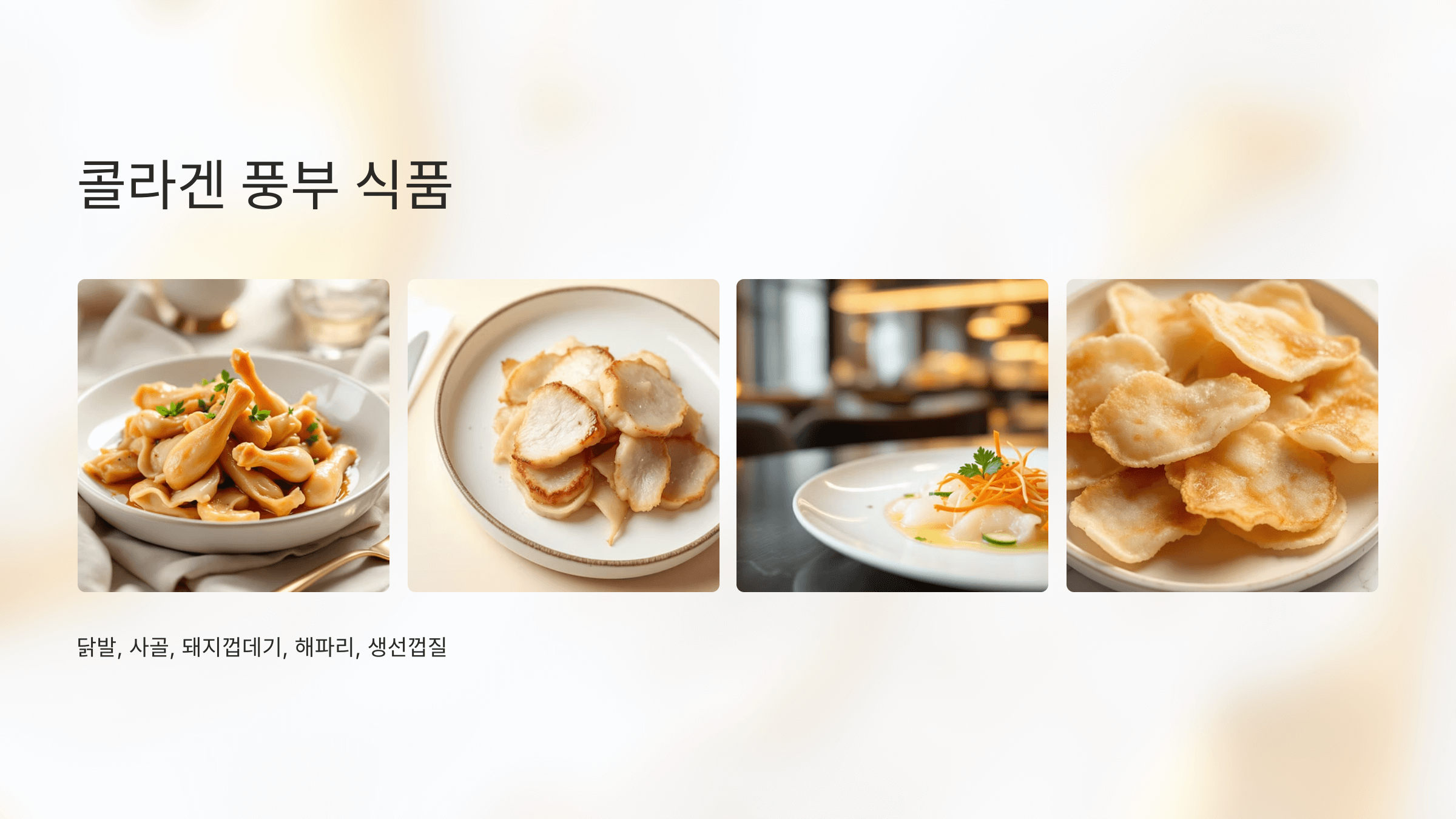 – 닭발, 사골, 돼지껍데기, 해파리, 생선껍질 등에 천연 콜라겐이 함유돼 있습니다.
